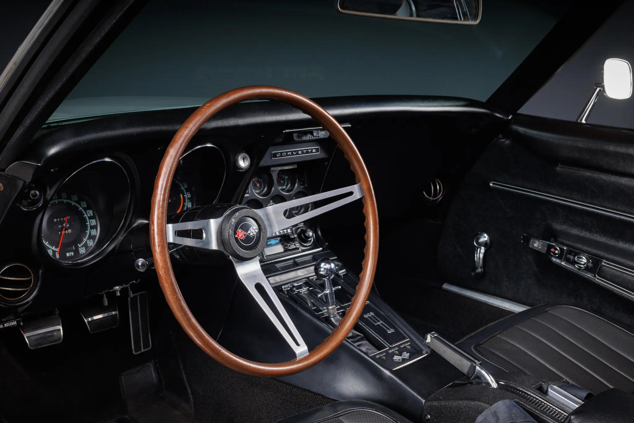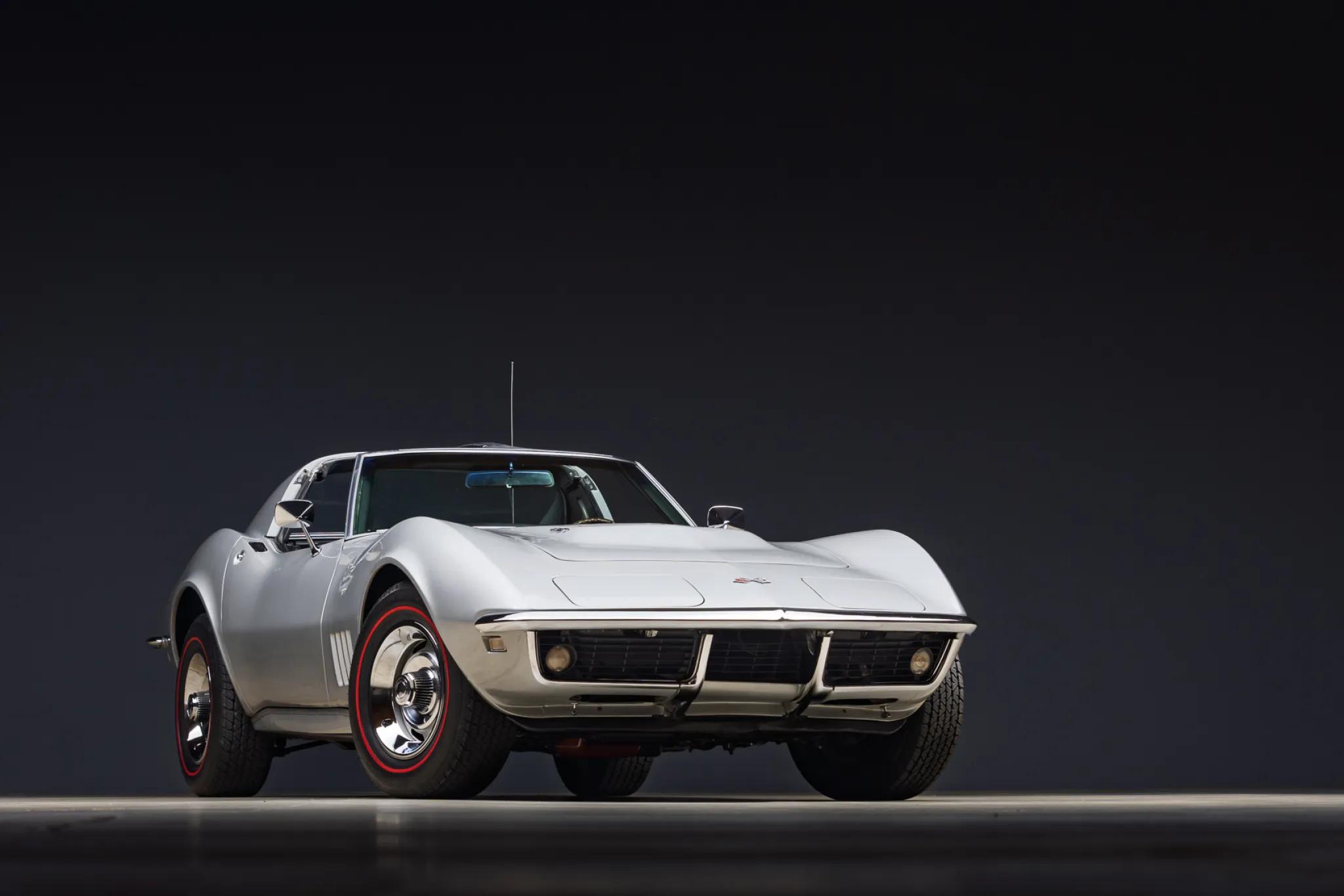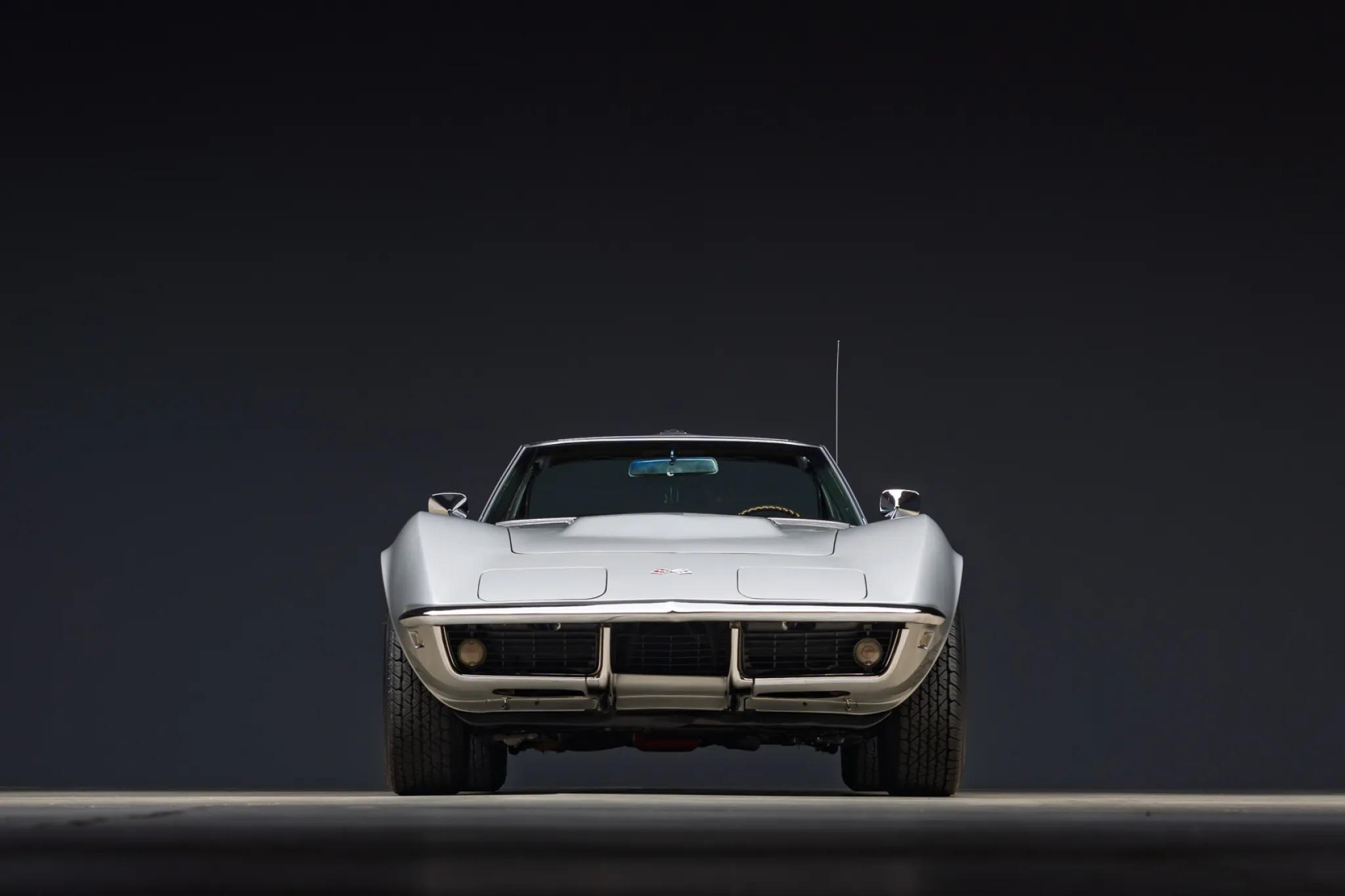 This 1968 Chevrolet Corvette coupe is powered by a 427ci L68 V8 paired with a four-speed manual transmission. Finished in Silverstone Silver over black vinyl, the car features removable roof panels, retractable headlights, dual side mirrors, chrome bumpers, side vents, and a rear luggage rack.