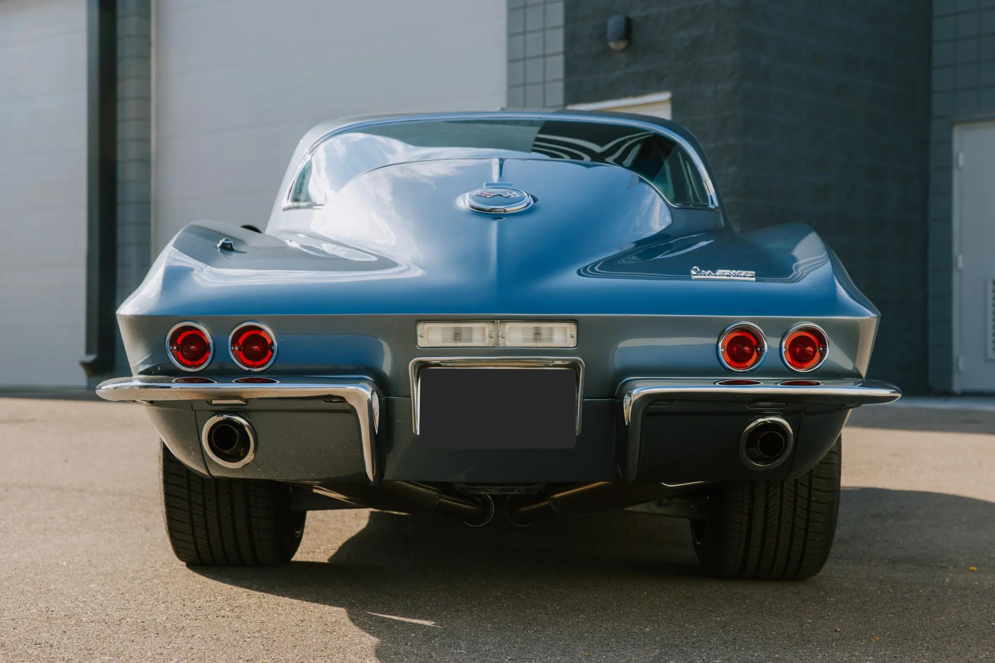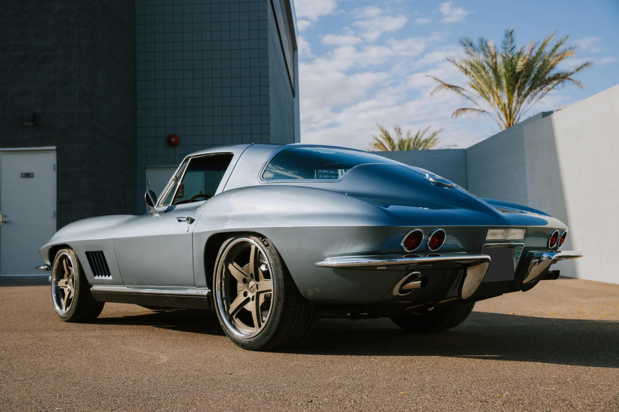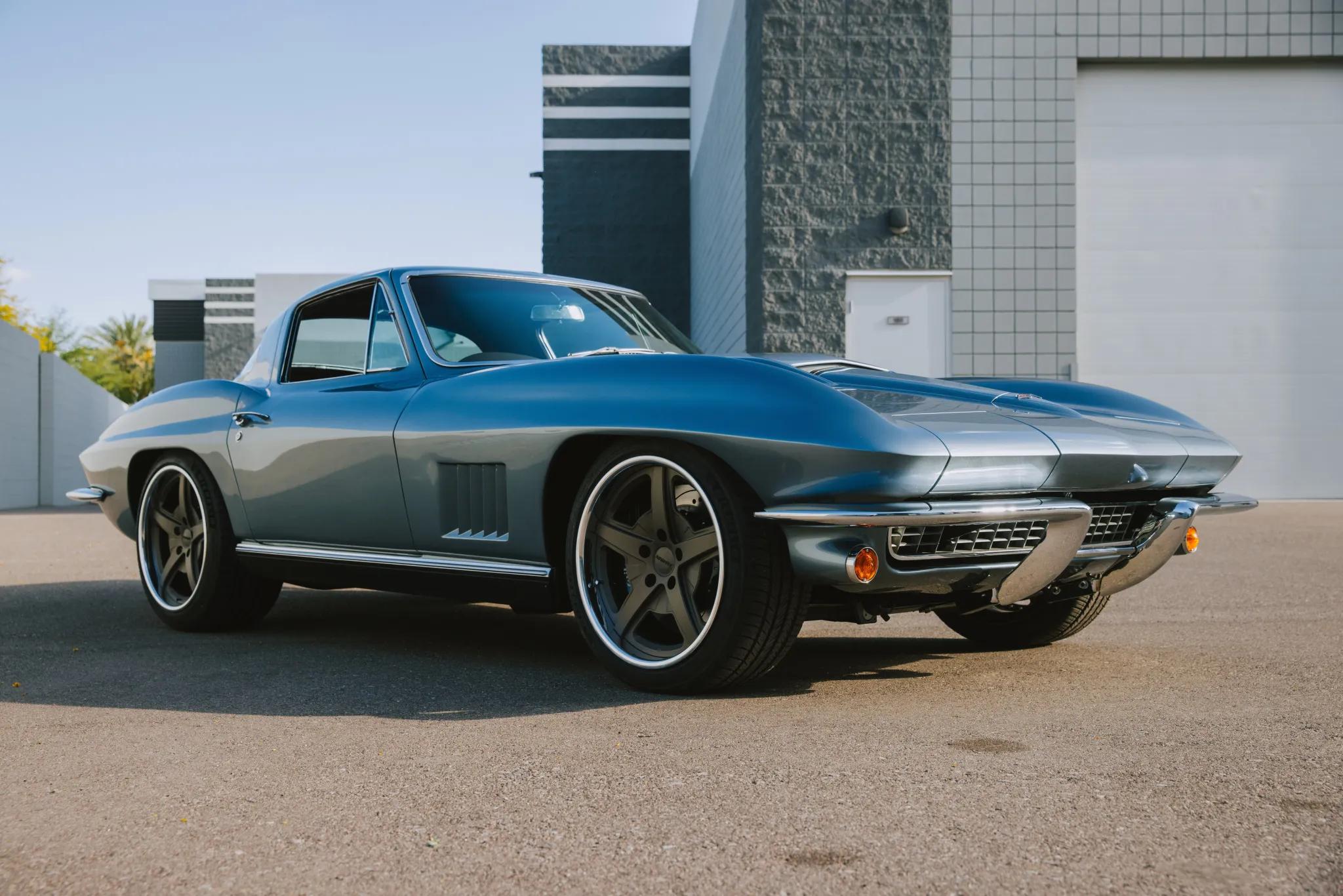This 1967 Chevrolet Corvette coupe was modified with a Roadster Shop SPEC7 chassis, C7-spec suspension, an LS3 V8, and a Tremec five-speed manual transmission. The car is finished in a light shade of Lyndale Blue with a silver blue hood stripe.