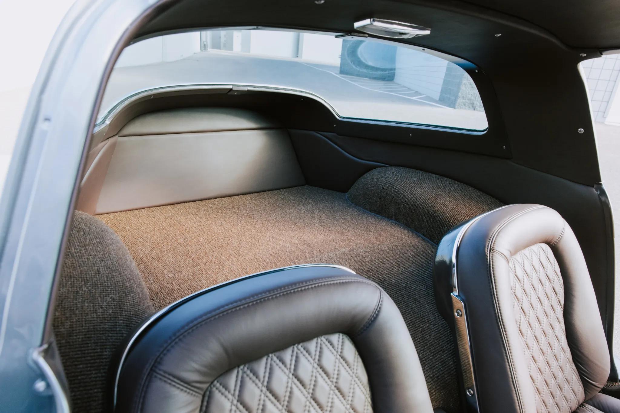 The cabin features bucket seats and door panels trimmed in diamond-stitched brown leather with matching dash coverings and square-weave carpets. Equipment includes Vintage Air air conditioning, a Bluetooth-capable stereo, power windows, a Flaming River tilt steering column, and Dakota Digital gauges.