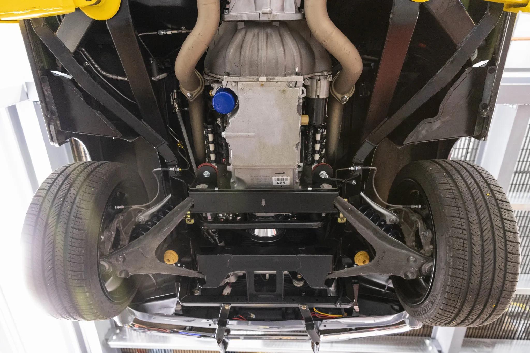The 6.2-liter LS3 V8 is equipped with Borla 8-stack electronic fuel injection, a Holley Terminator X controller, Hooker exhaust manifolds, and a Dewitt aluminum radiator with dual fans. Power is sent to the rear wheels through a Tremec five-speed manual transmission and a dual exhaust system with a crossover pipe and polished stainless-steel mufflers.