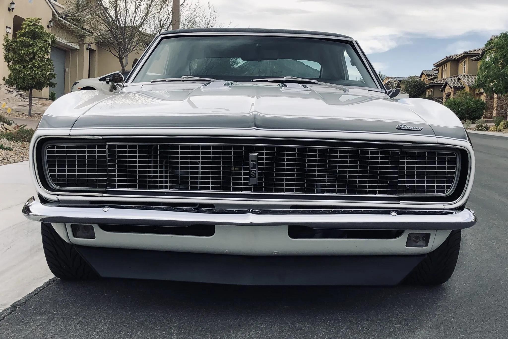 This 1968 Chevrolet Camaro coupe is finished in white with a black vinyl roof and black interior with houndstooth inserts. It is powered by a 6.0-liter LS V8 linked to a Tremec six-speed manual transmission. The car was refurbished prior to the seller's acquisition in January 2022, with work including installation of a cold-air intake system, aluminum radiator, electric cooling fans, chrome engine trim, stainless steel exhaust system, Wilwood disc brakes at all four corners, tubbed wheel wells, US Mags alloy wheels (17" front, 18" rear) wrapped in 235/45 and 255/45 Federal Super Steel 595 tires, hideaway headlights, RS badging, Super Sport-style front stripe, front and rear spoilers, dual mirrors, and Dakota Digital instrumentation. Additional mechanical updates include an aluminum driveshaft and Strange Engineering axles.