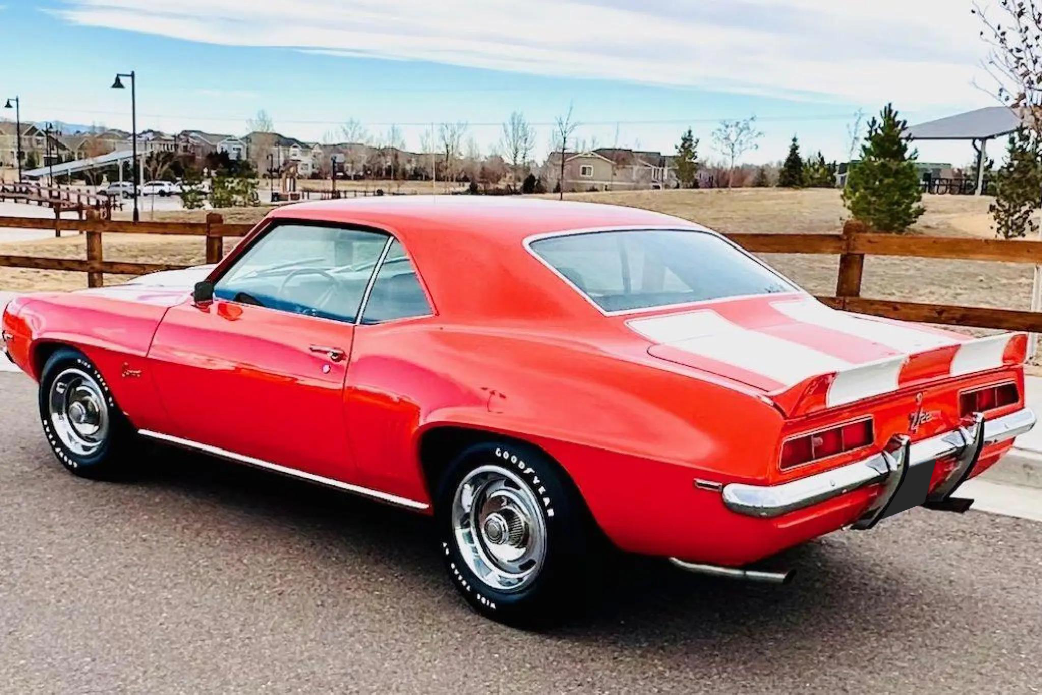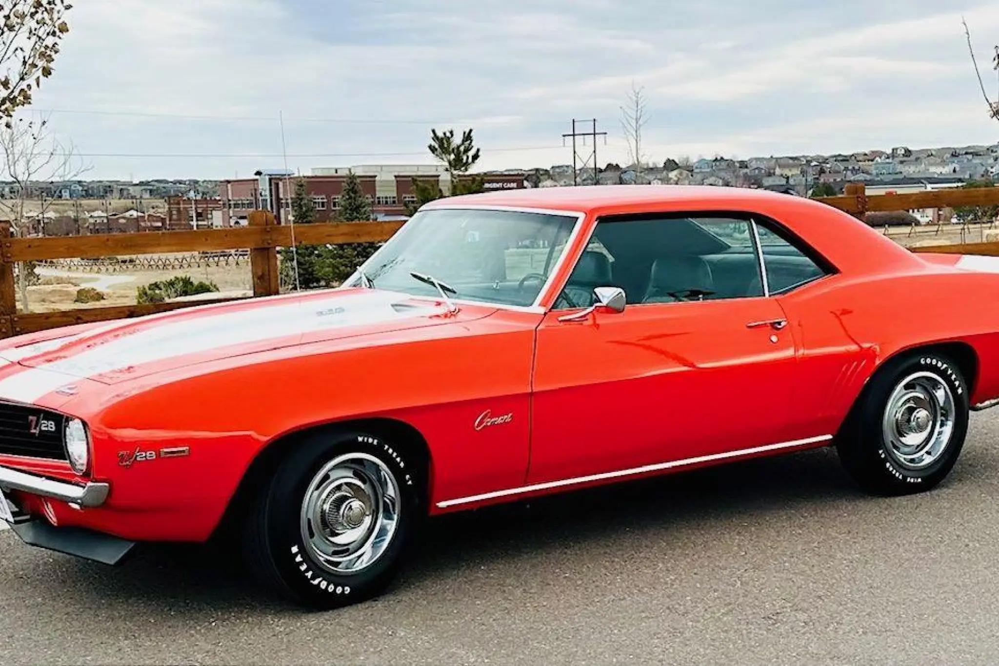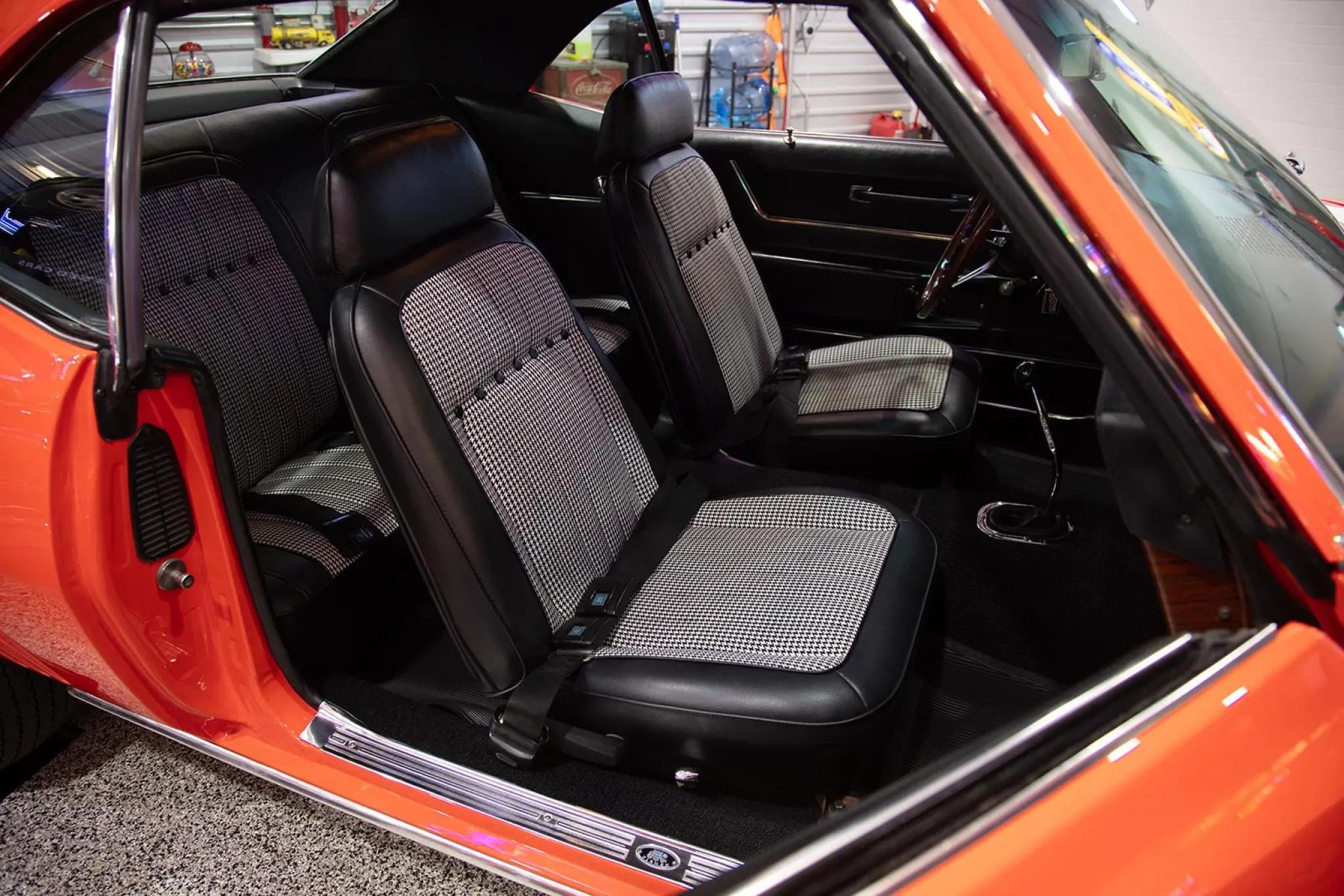 This 1969 Chevrolet Camaro coupe was delivered new to Frontier Chevrolet of Billings, Montana, and remained in the state until the seller's acquisition in 2022. The car underwent a refurbishment by the previous owner in 2018 after roughly 35 years of storage, which included refinishing the body in Hugger Orange with white stripes and reupholstering the interior in black and ivory vinyl houndstooth. It is powered by a replacement 302ci V8 paired with a Muncie M21 four-speed manual transmission and a PosiTraction differential.