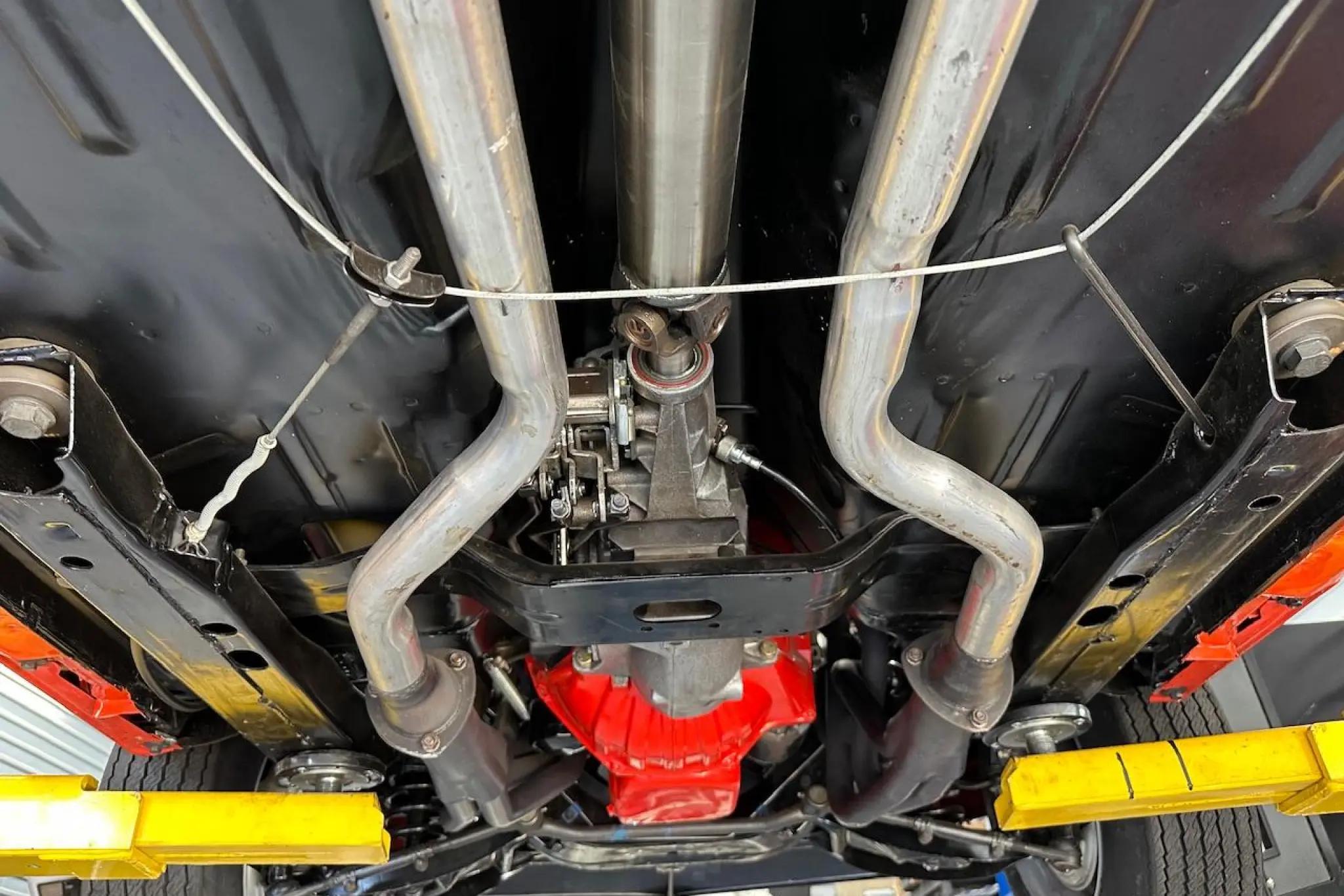 The replacement 302ci V8 was overhauled during the refurbishment and equipped with an aluminum intake manifold and Holley carburetor. The heater core was replaced and an oil change was performed in preparation for the sale. Suspension work under current ownership included replacement of coil springs, leaf springs, and shocks. Power is sent to the rear wheels through the four-speed manual transmission and PosiTraction differential. The five-digit odometer shows 65,000 miles, approximately 400 of which were added under current ownership.