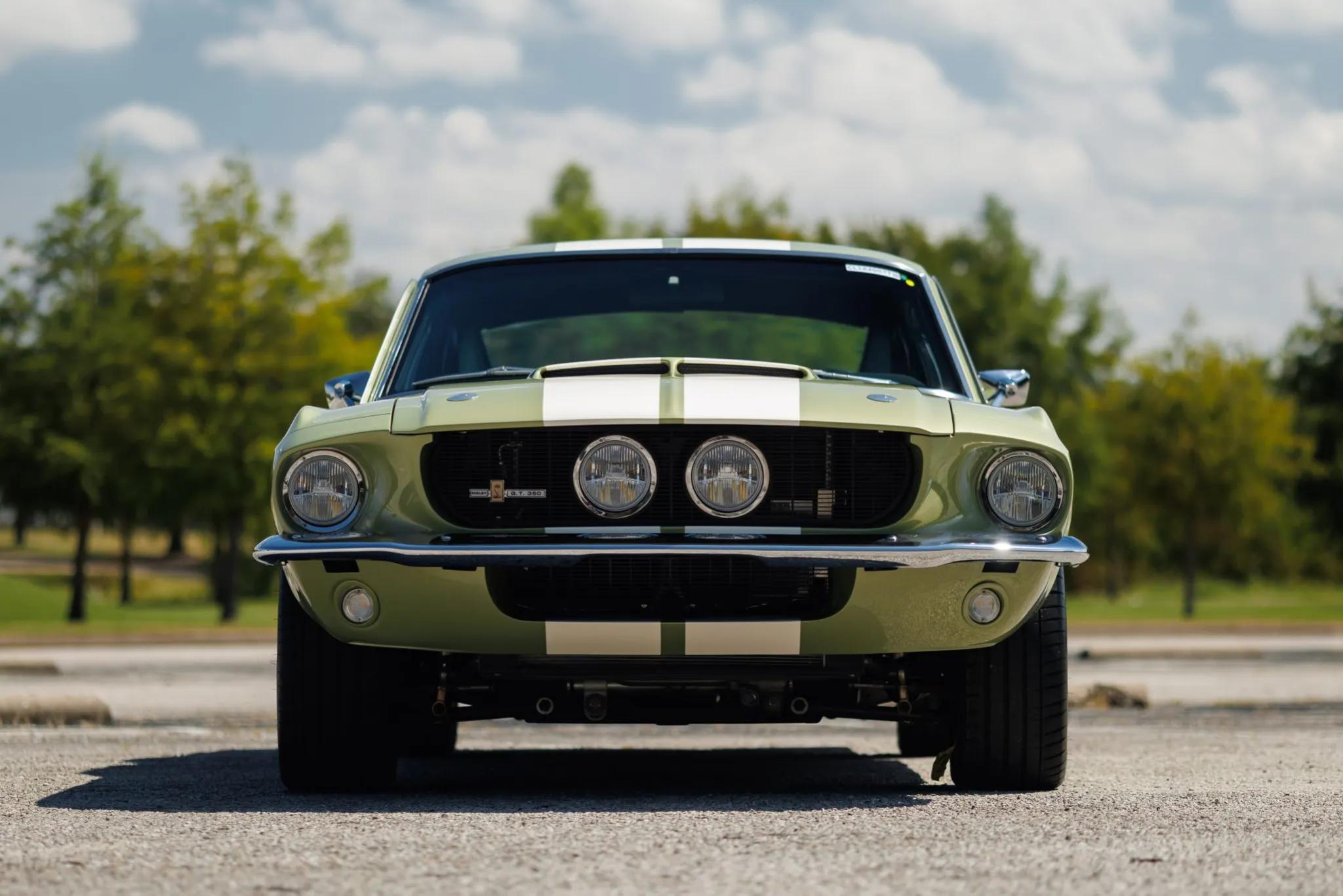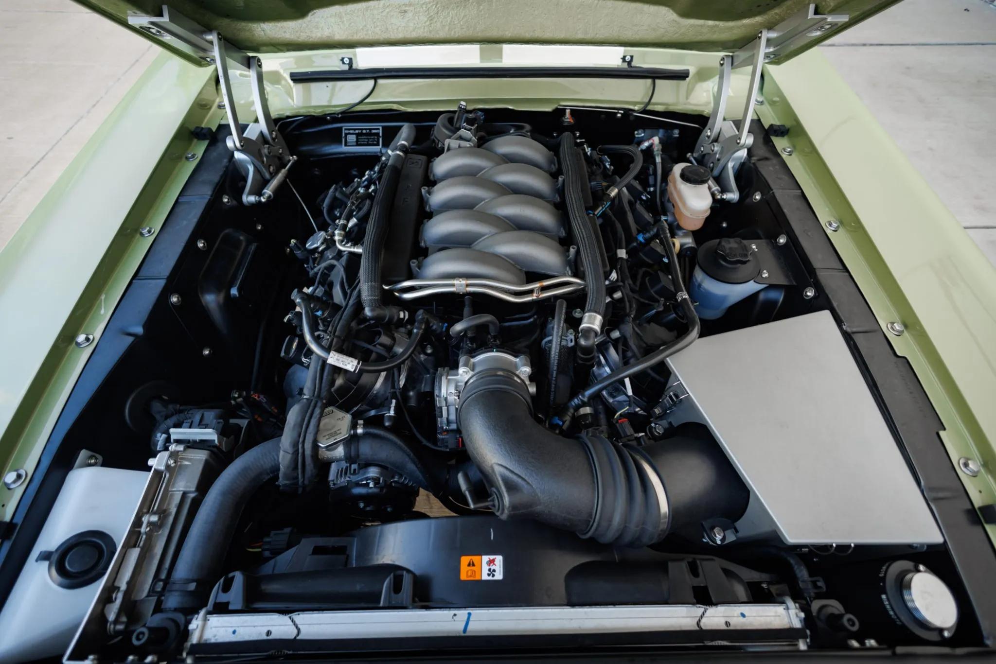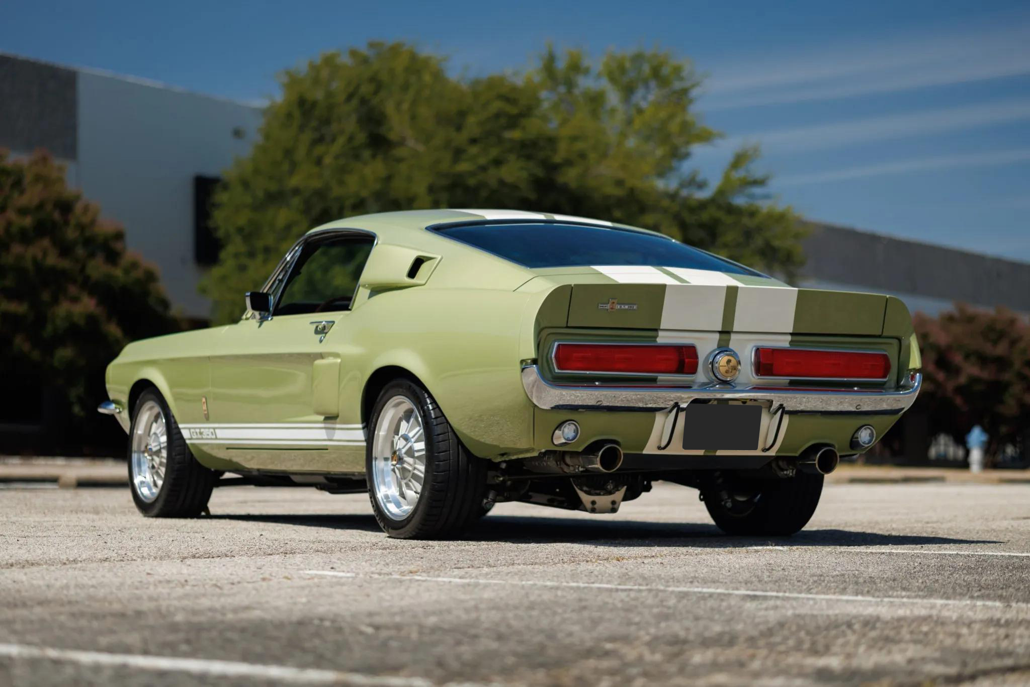 This Shelby Mustang GT350 fastback recreation is finished in Lime Gold with Wimbledon White stripes and is powered by a 5.0-liter Gen 3 Coyote V8 paired with a 10-speed automatic transmission. The bolstered front seats and folding rear seats are upholstered in black Nappa leather, with matching dashboard and door panels. Interior amenities include air conditioning, remote keyless entry, push-button ignition, power windows and locks, three-point inertia-reel front seatbelts, and a touchscreen entertainment system with a reversing camera. The wood-rimmed steering wheel is mounted to a tilting column. The 120-mph speedometer and 8k-rpm tachometer feature inset digital displays, complemented by gauges for fuel level, oil pressure, and coolant temperature. The digital odometer shows 2,300 miles, representing distance driven since completion.
