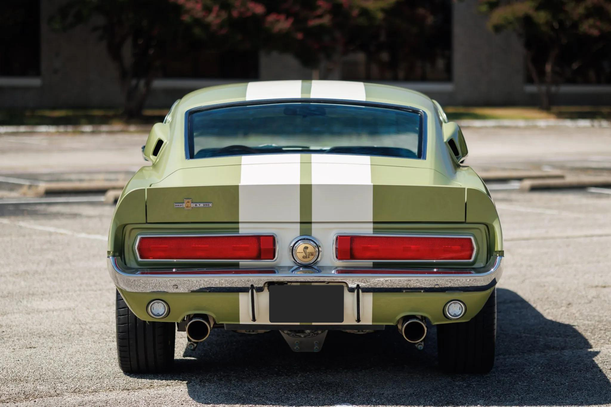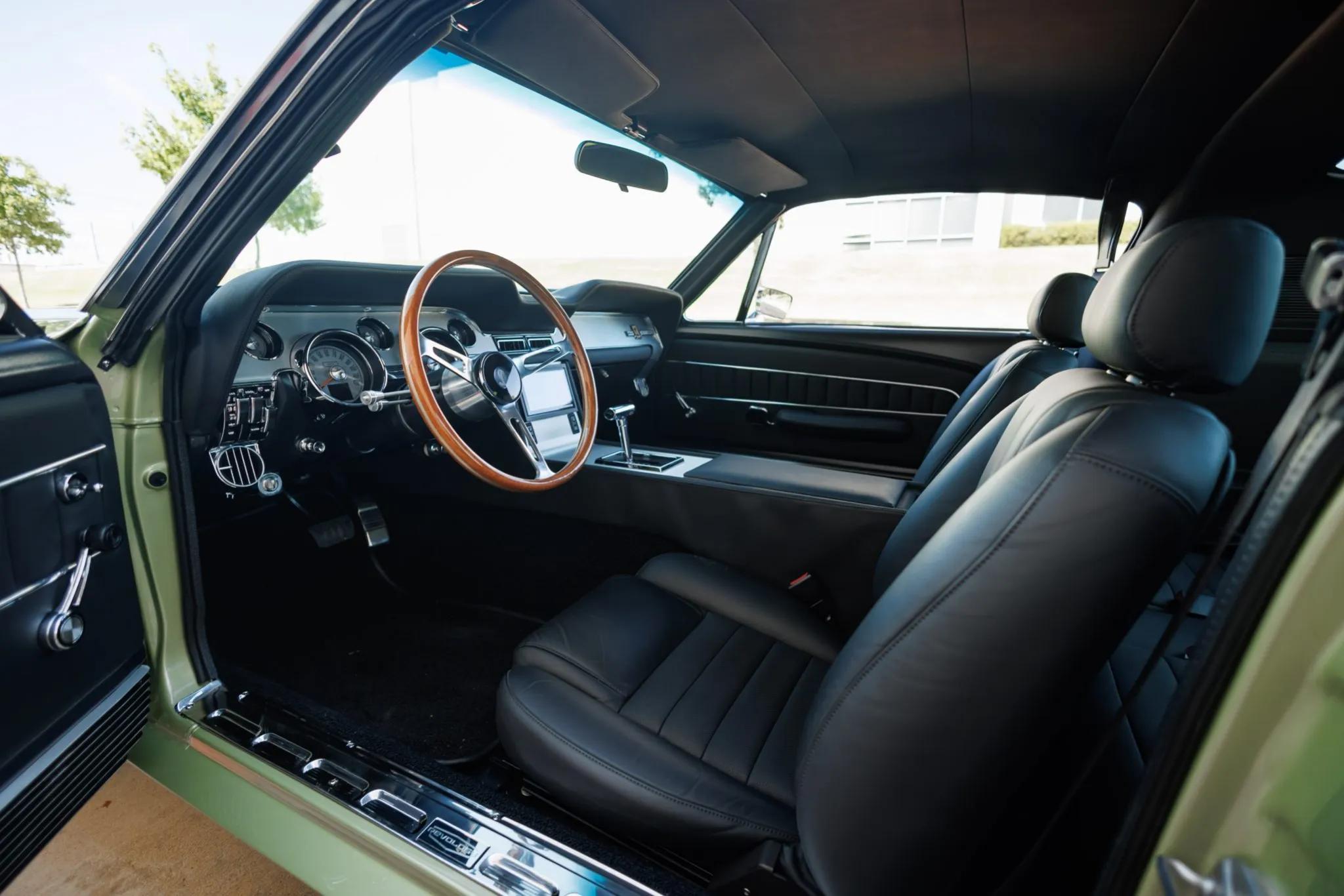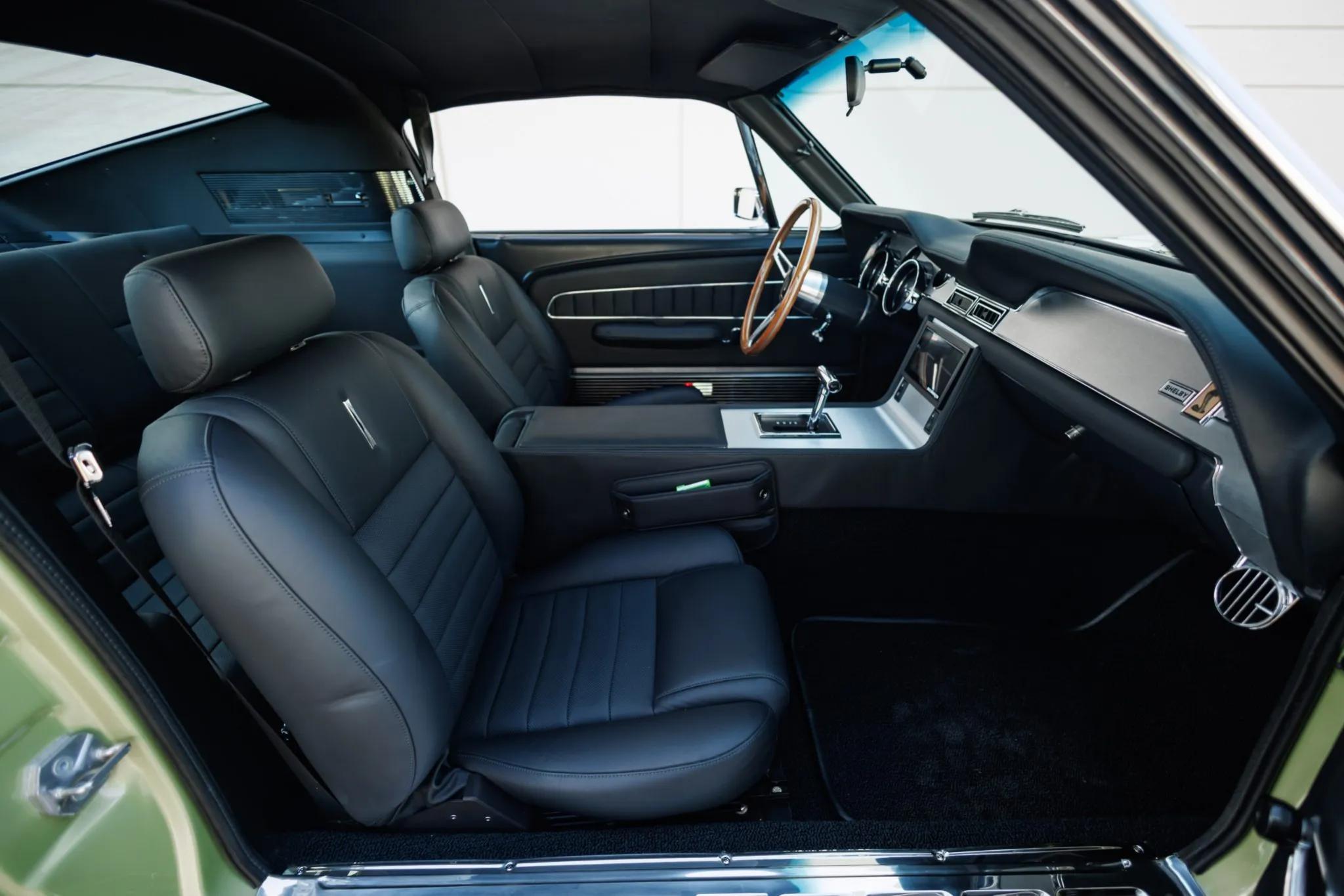 This Shelby Mustang GT350 fastback recreation is finished in Lime Gold with Wimbledon White stripes and is powered by a 5.0-liter Gen 3 Coyote V8 paired with a 10-speed automatic transmission. The bolstered front seats and folding rear seats are upholstered in black Nappa leather, with matching dashboard and door panels. Interior amenities include air conditioning, remote keyless entry, push-button ignition, power windows and locks, three-point inertia-reel front seatbelts, and a touchscreen entertainment system with a reversing camera. The wood-rimmed steering wheel is mounted to a tilting column. The 120-mph speedometer and 8k-rpm tachometer feature inset digital displays, complemented by gauges for fuel level, oil pressure, and coolant temperature. The digital odometer shows 2,300 miles, representing distance driven since completion.
