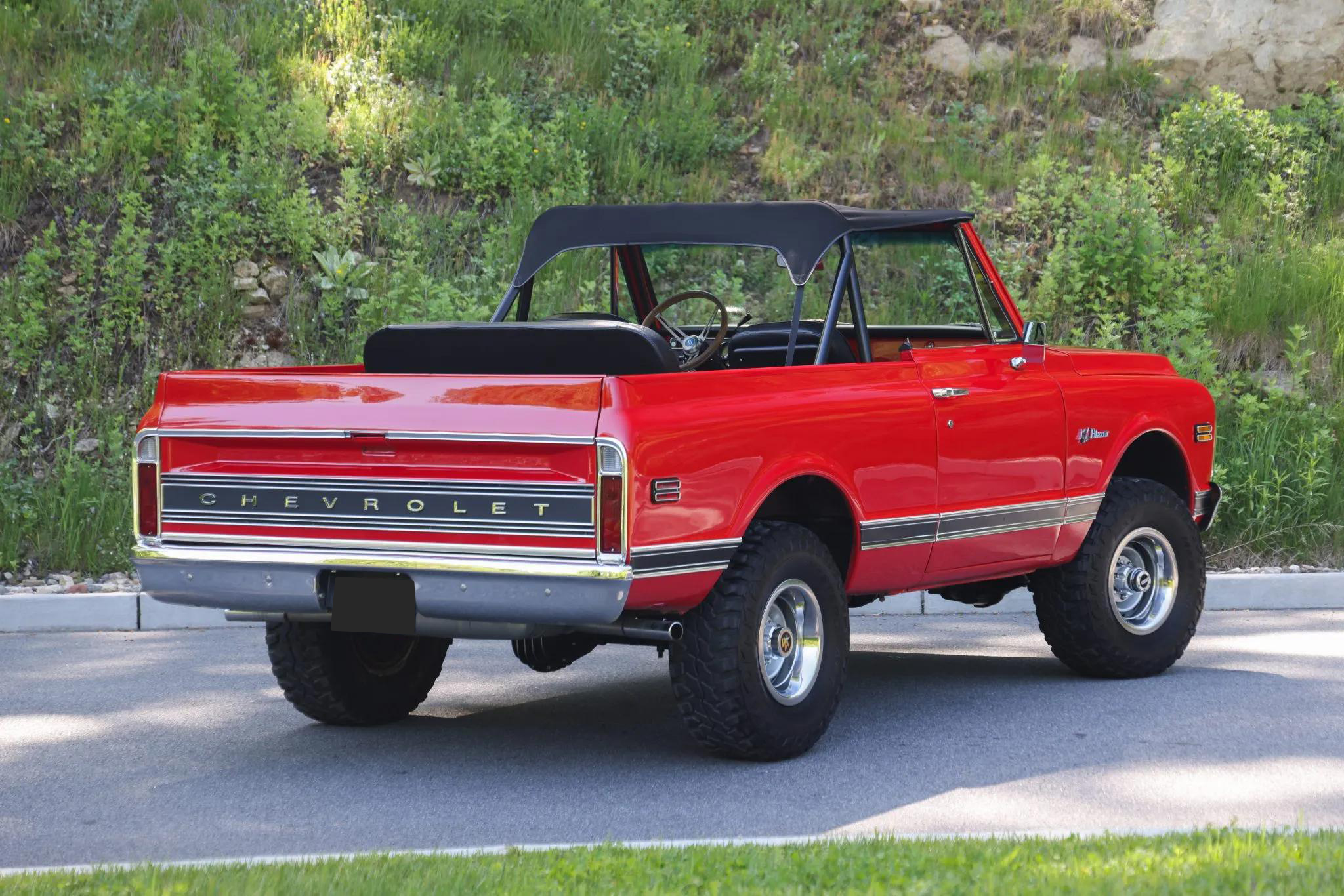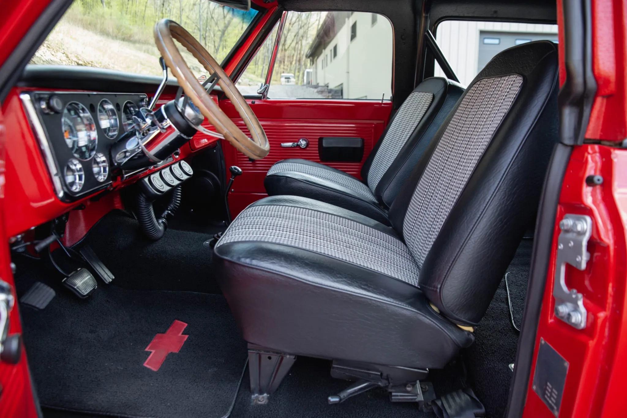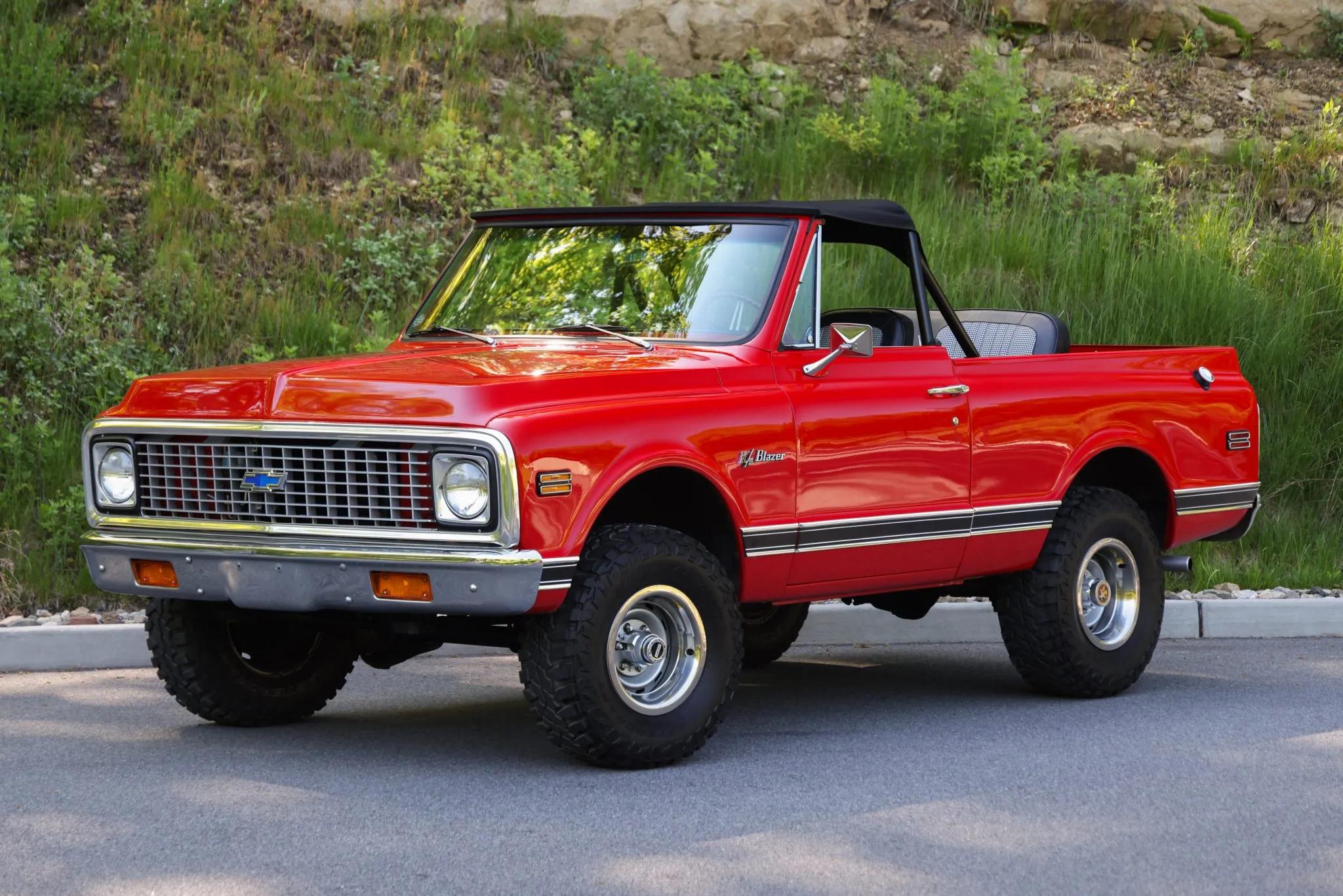 This 1971 Chevrolet K5 Blazer is finished in red over black vinyl seats with houndstooth inserts and is powered by a carbureted 350ci V8 paired with a three-speed TH350 automatic transmission and a dual-range transfer case. The body was removed from the frame for rust repair and refinished in red, and the truck rides on 15" Rally-style wheels fitted with 32�11.50" Mastercraft Courser MXT tires.