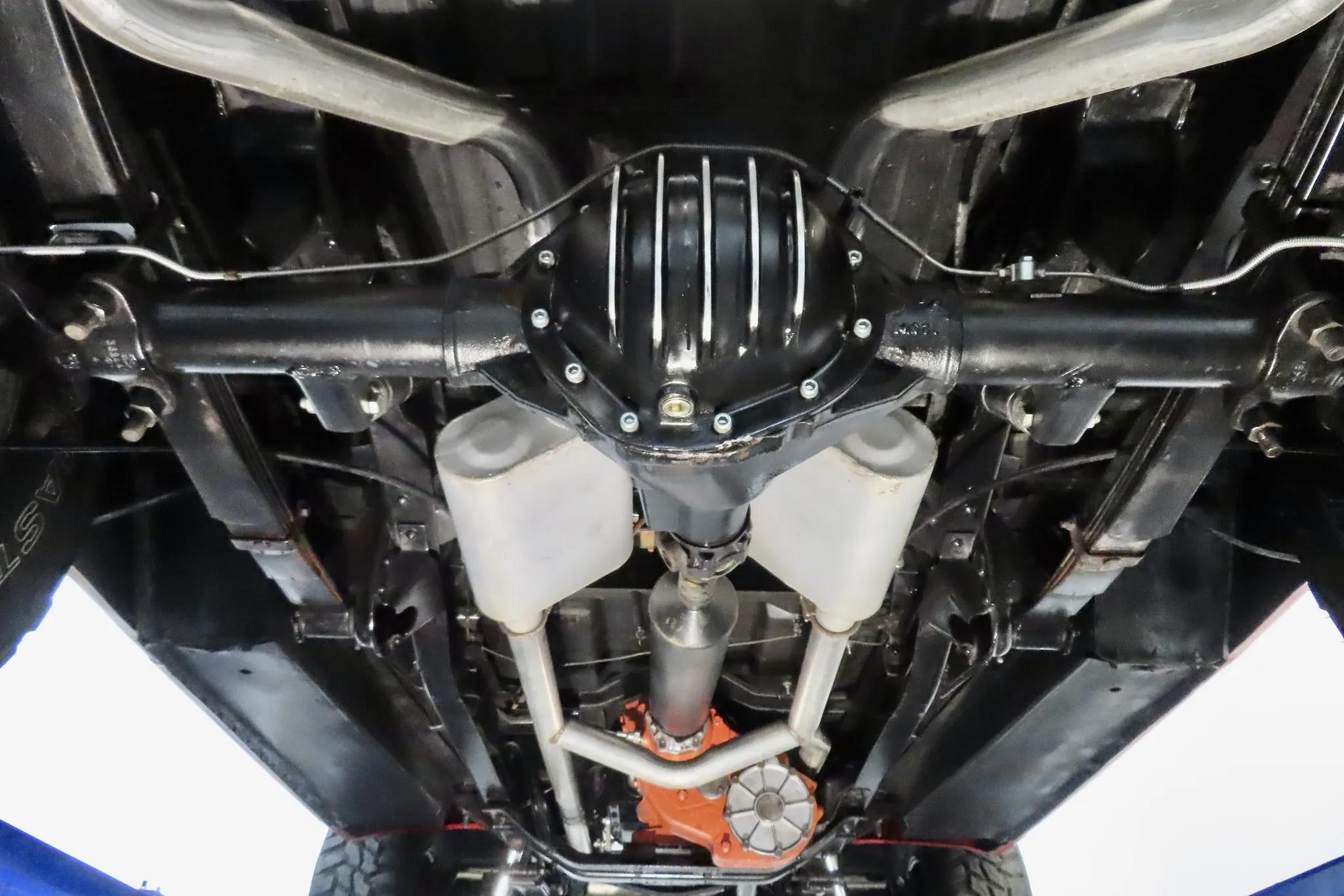 The 350ci V8 was overhauled during refurbishment, with the oil pan, timing cover, and valve covers resealed. Power is delivered to the rear or all four wheels through the TH350 automatic transmission and dual-range transfer case, with a transmission linkage bushing replaced during service. Fluid maintenance was performed in preparation for use.