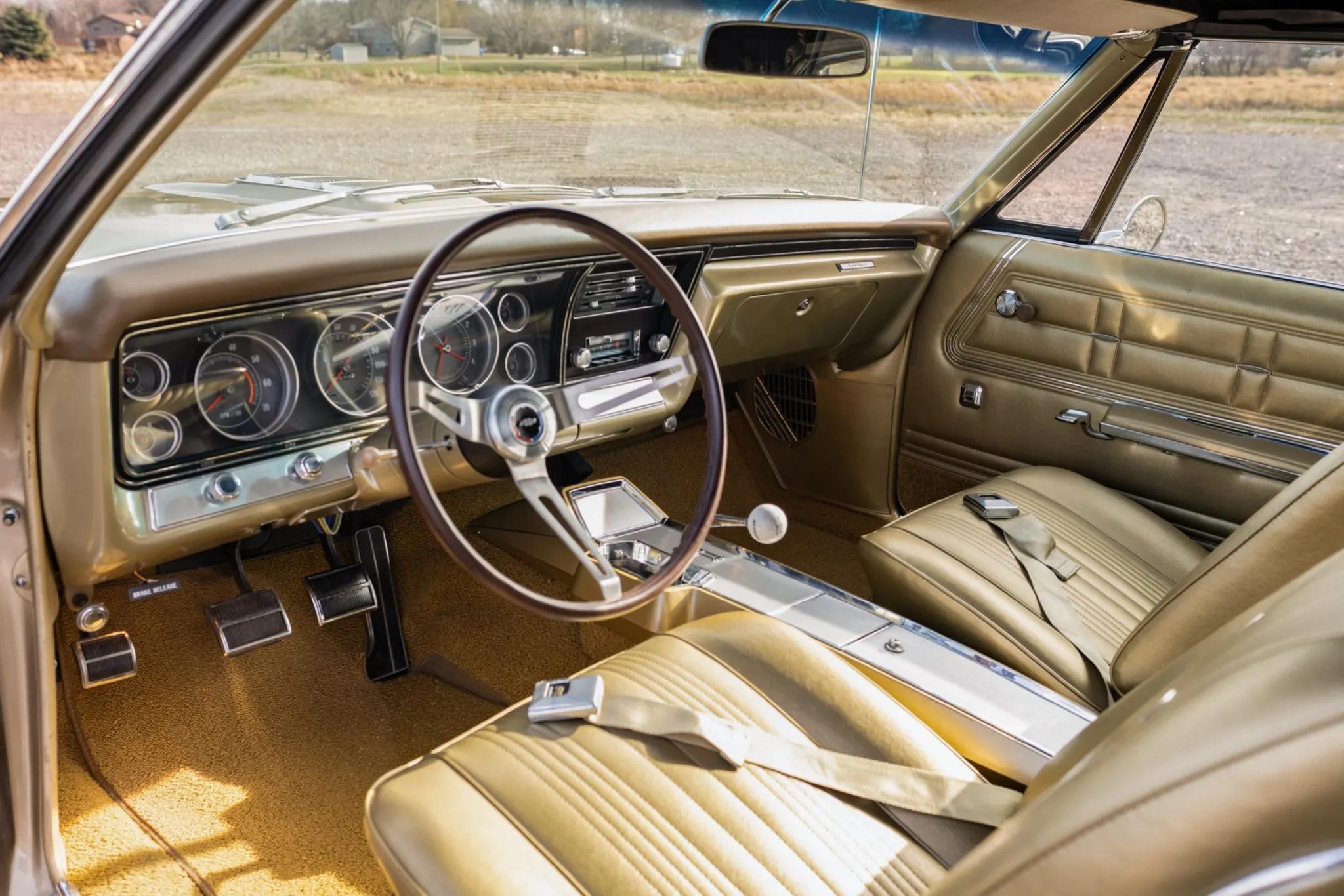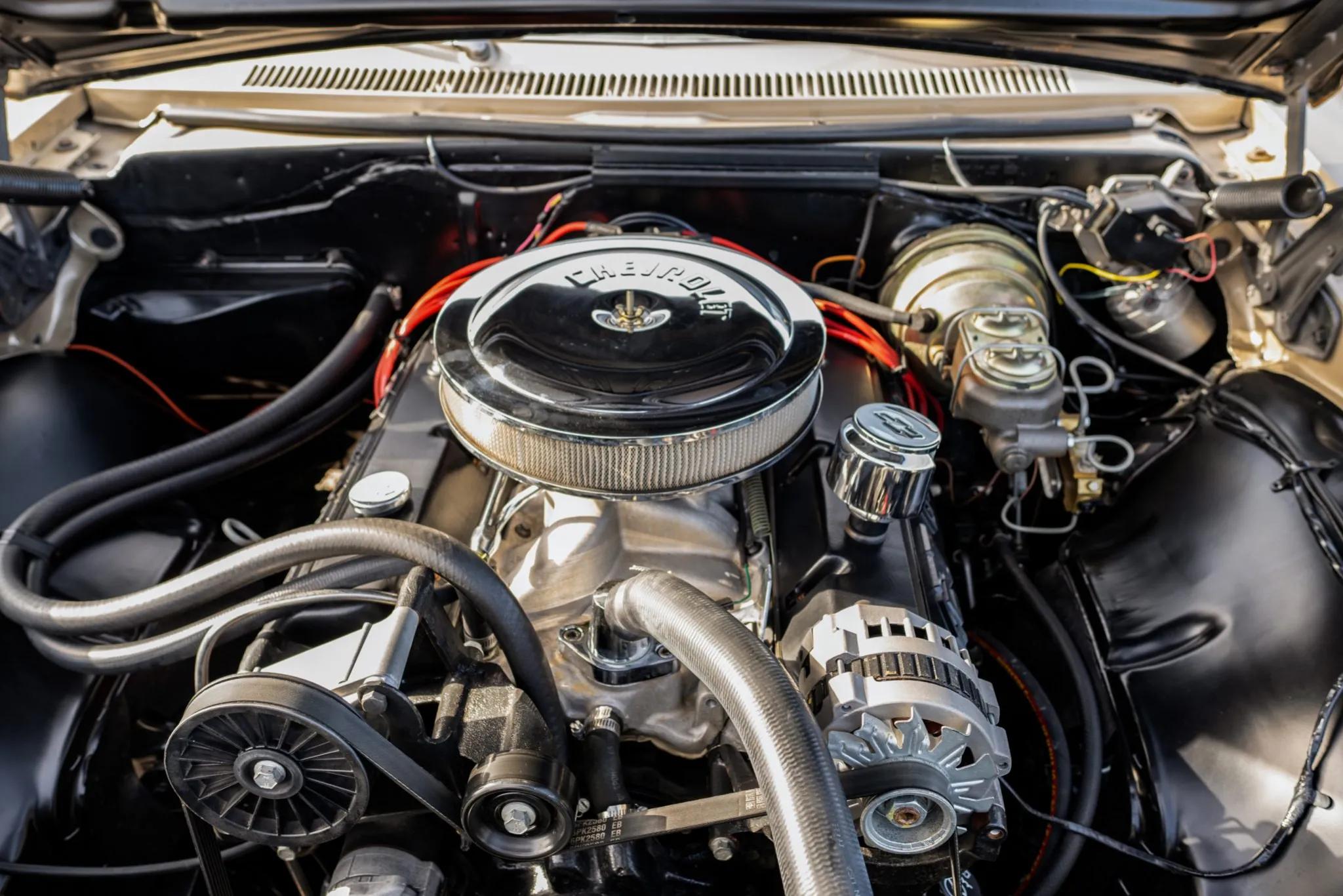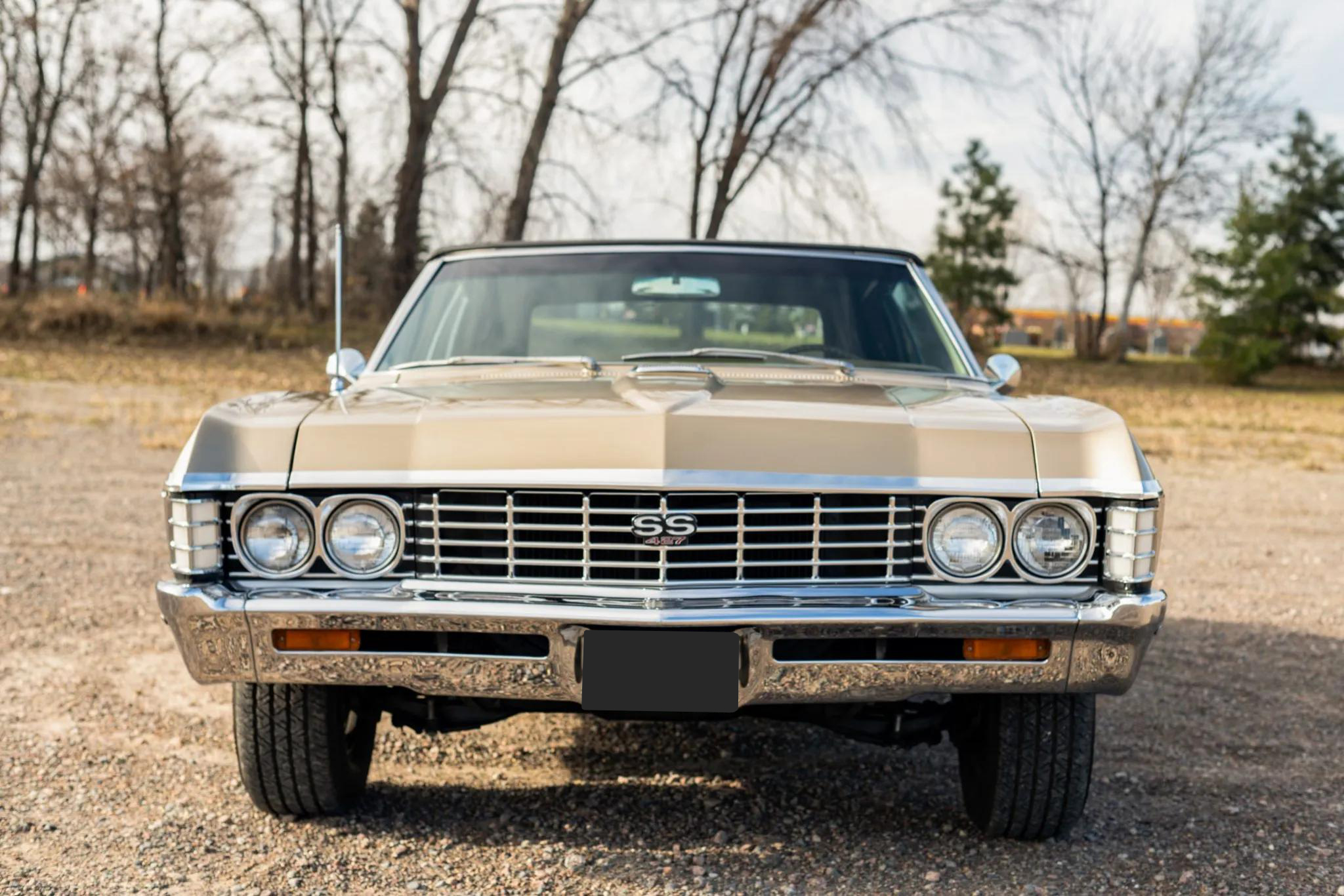 This 1967 Chevrolet Impala SS convertible is finished in gold with a black power-operated soft top and features a gold vinyl interior. It is powered by a ZZ427 427ci crate V8 rated at 430 horsepower, equipped with an aluminum intake manifold and cylinder heads, an HEI distributor, a four-barrel carburetor, and a serpentine accessory drive system. Power is sent to the rear wheels through a Tremec five-speed manual transmission and a limited-slip differential with a custom-fabricated driveshaft.