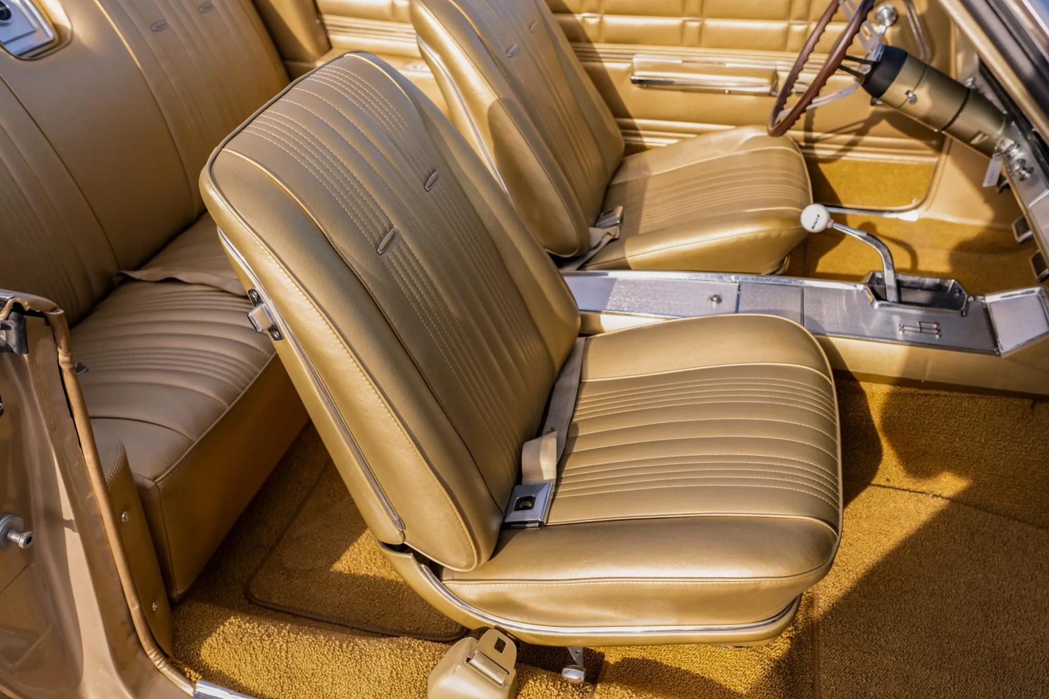 The cabin includes front bucket seats and a rear bench upholstered in gold vinyl with matching carpets and door panels. Appointments include a center console, Hurst shifter, power windows, AM/FM radio, cabin heater, and a three-spoke steering wheel. Instrumentation consists of a 120-mph speedometer, tachometer, analog clock, and gauges for fuel level, oil pressure, coolant temperature, and battery status. The five-digit odometer shows 270 miles since refurbishment.