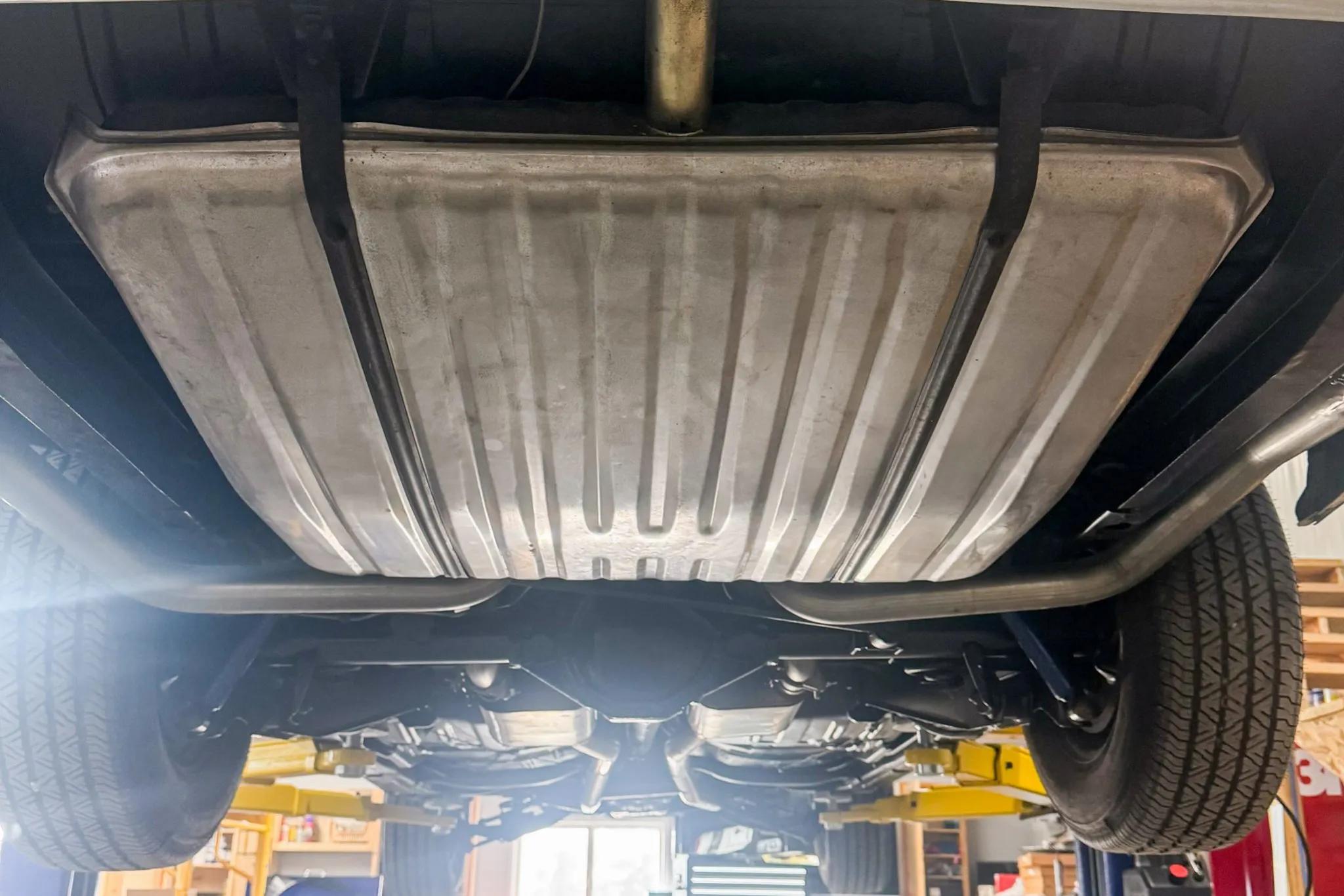 Exterior features include chrome rocker moldings, faux hood vents, dual exhaust outlets, and 15" Rally wheels mounted with 225/70 Firestone Firehawk Pv41 tires. The car rides on coil-spring suspension, and braking is handled by power-assisted front discs and rear drums.