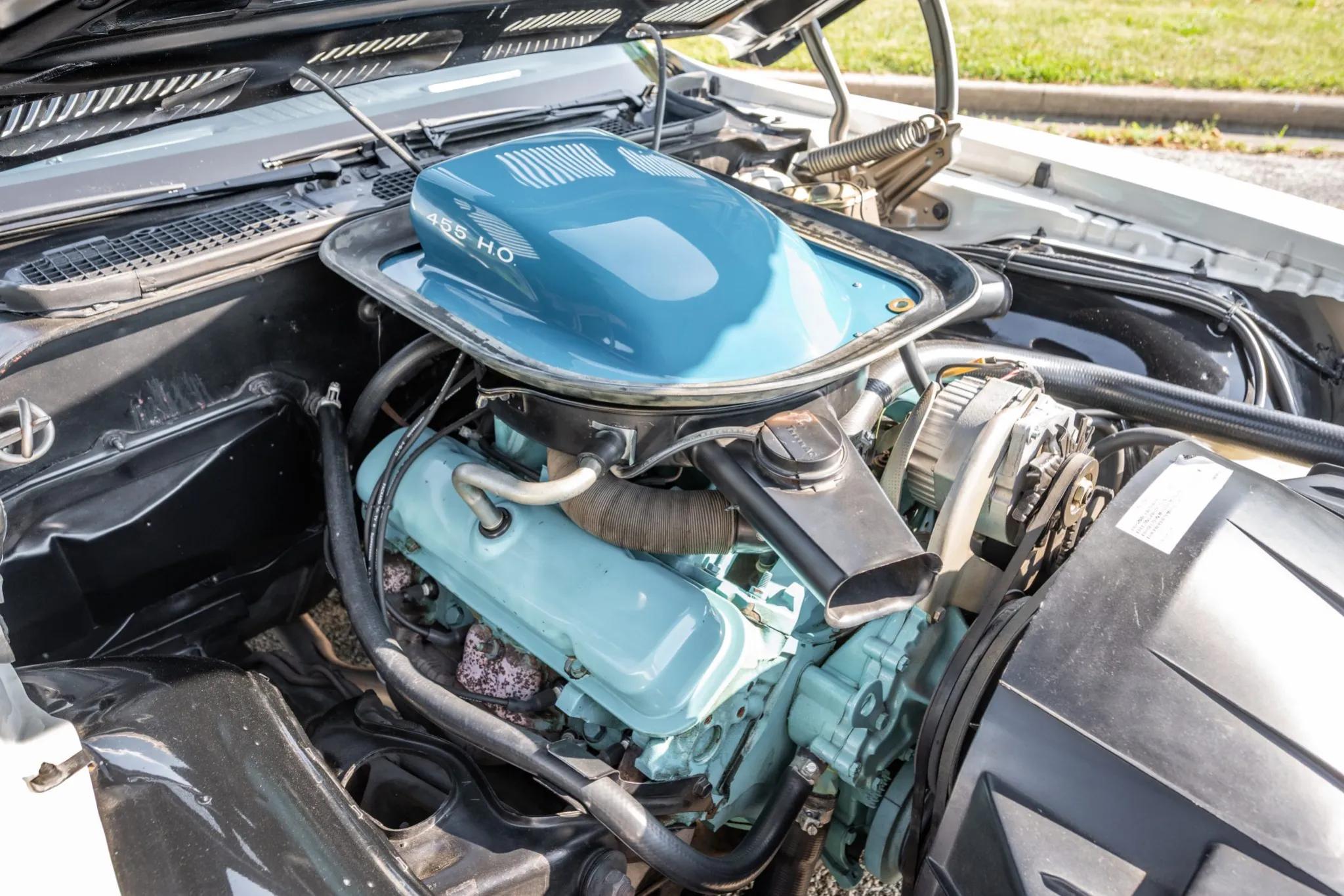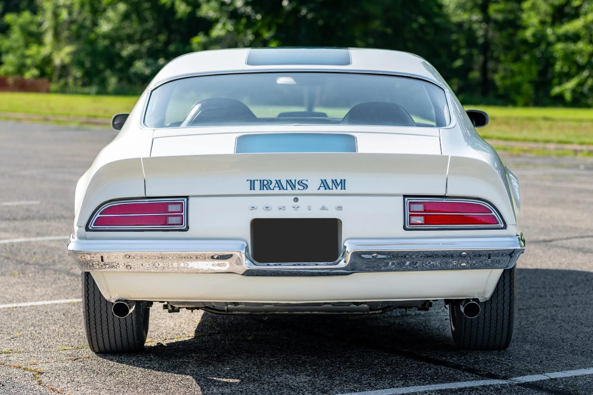 This 1971 Pontiac Firebird Trans Am is finished in white with a black interior and is powered by a 455ci High Output V8 equipped with a Rochester four-barrel carburetor. Power is sent to the rear wheels through a four-speed manual transmission and a Safe-T-Track limited-slip differential. The car features a shaker hood, front air dam, rear decklid spoiler, front fender vents, dual exhaust outlets, and 15" Rally II wheels mounted with F60-15 Goodyear Polyglas tires. Stopping power is provided by power-assisted front disc and rear drum brakes, and it is equipped with power steering.