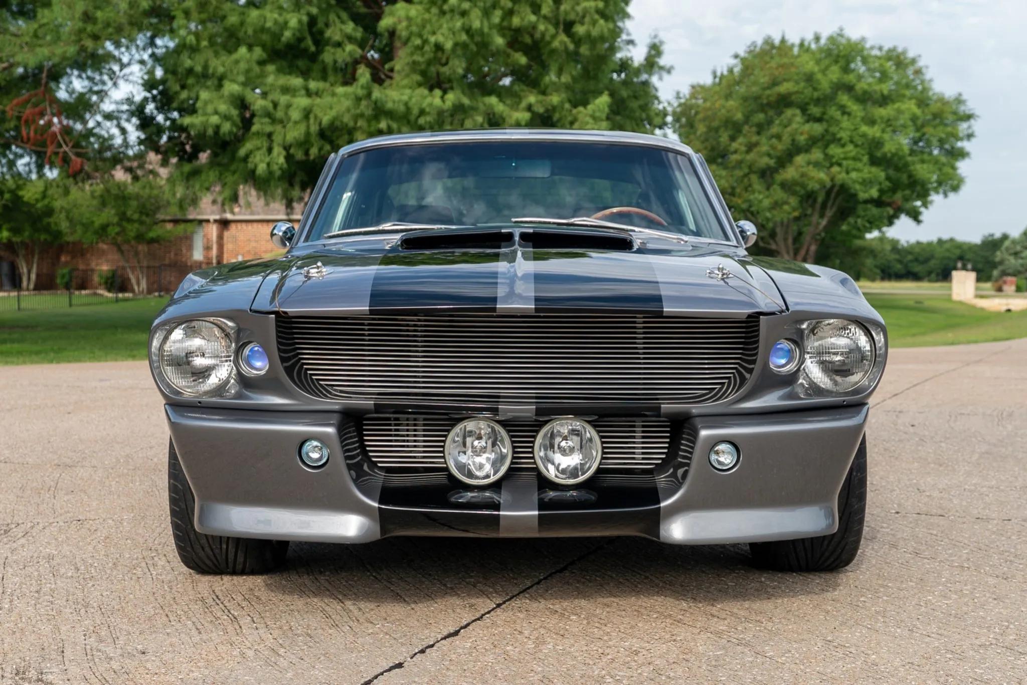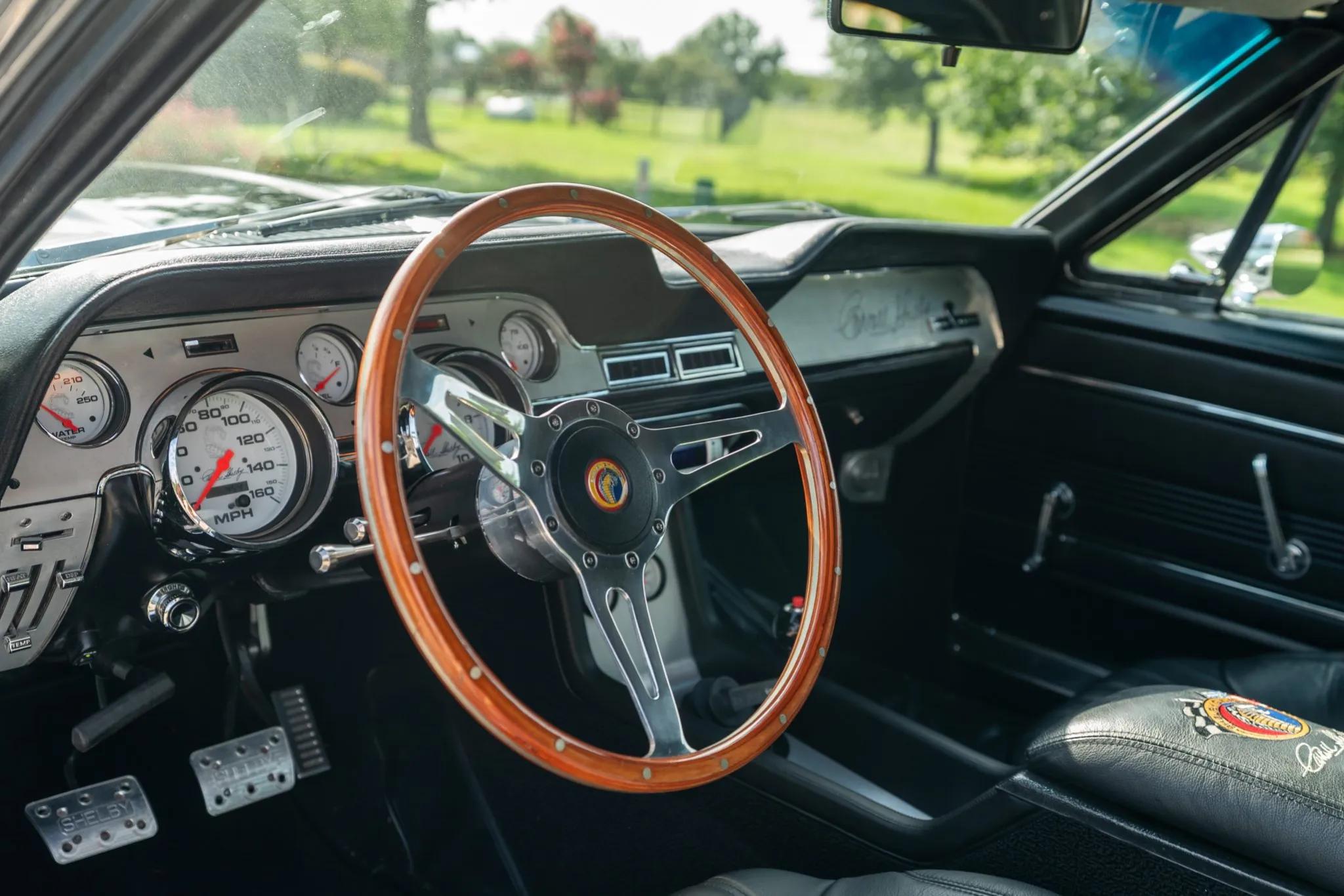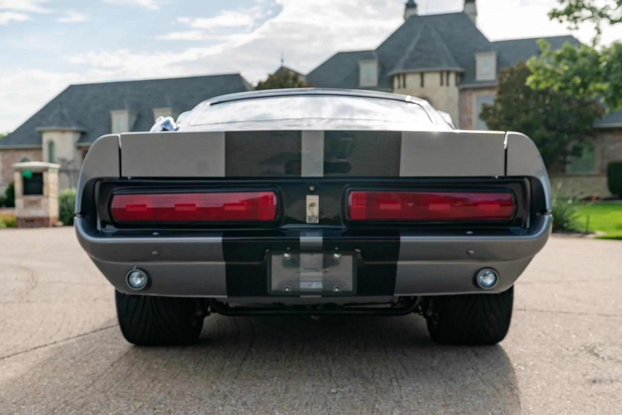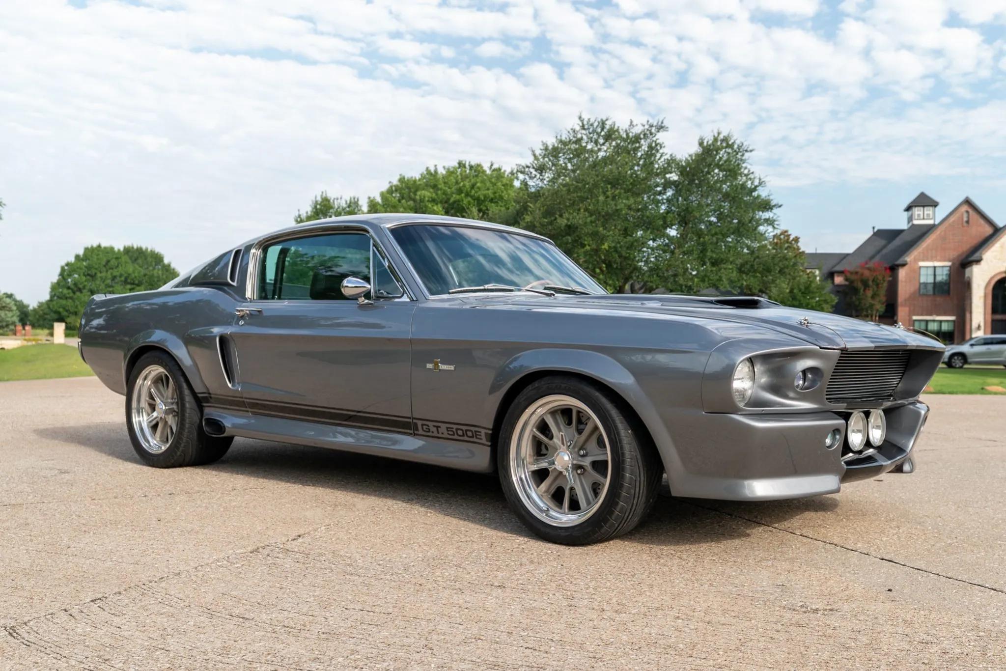 This 1968 Ford Mustang fastback was built into a 1967 Shelby GT500E by Unique Performance in 2003 and carries serial number 007. The car features Eleanor-style bodywork finished in Pepper Grey with black stripes, and a black leather interior. Power comes from a fuel-injected 427ci V8 with an eight-stack induction system. Power is sent to the rear wheels through a reinforced chassis and modified suspension.