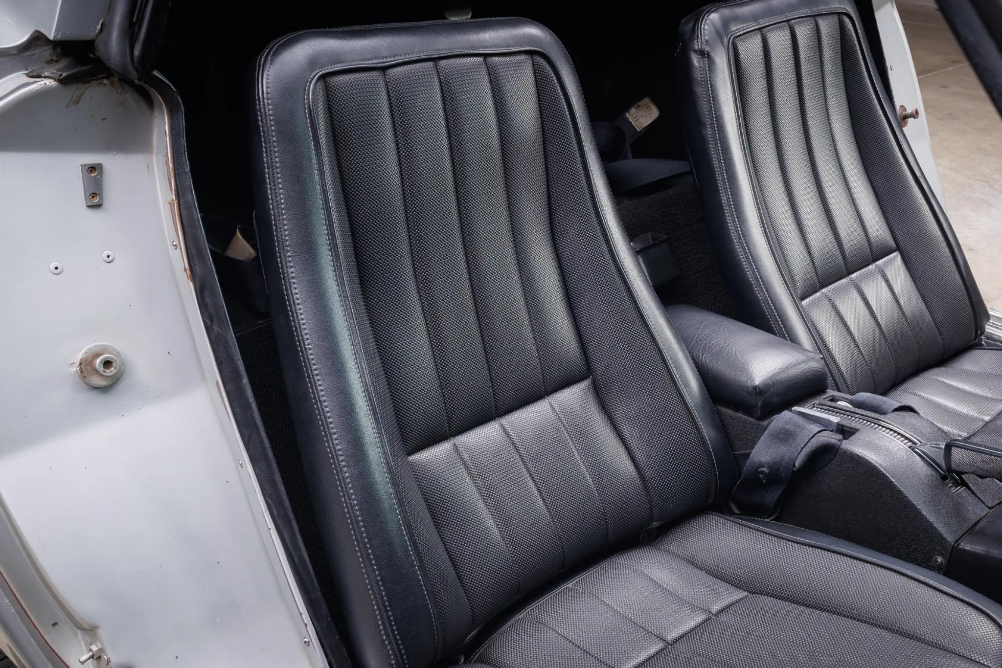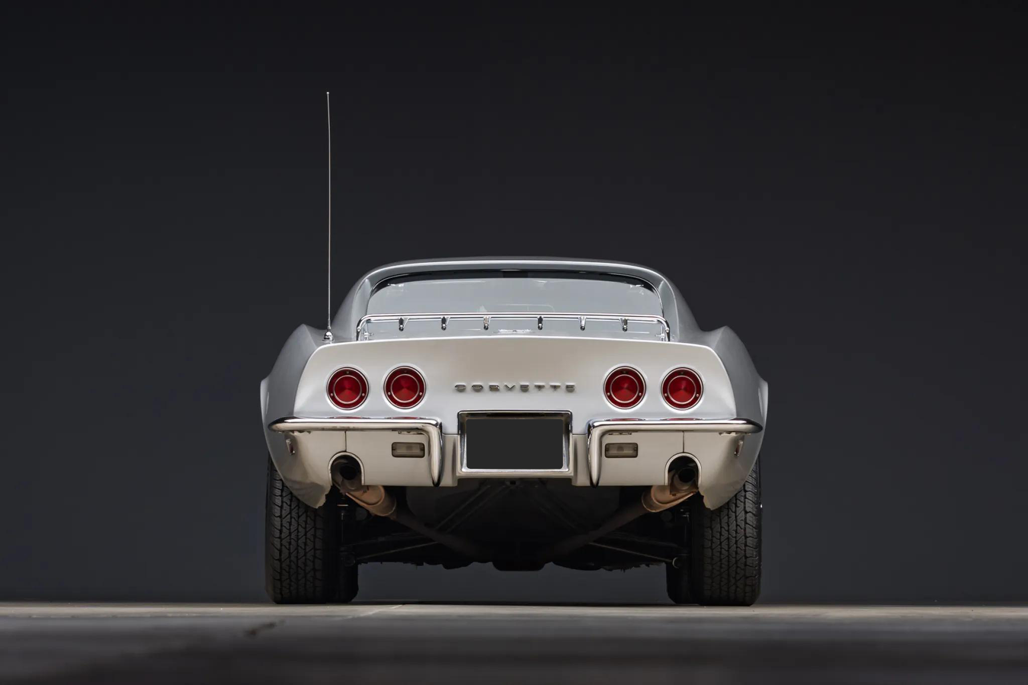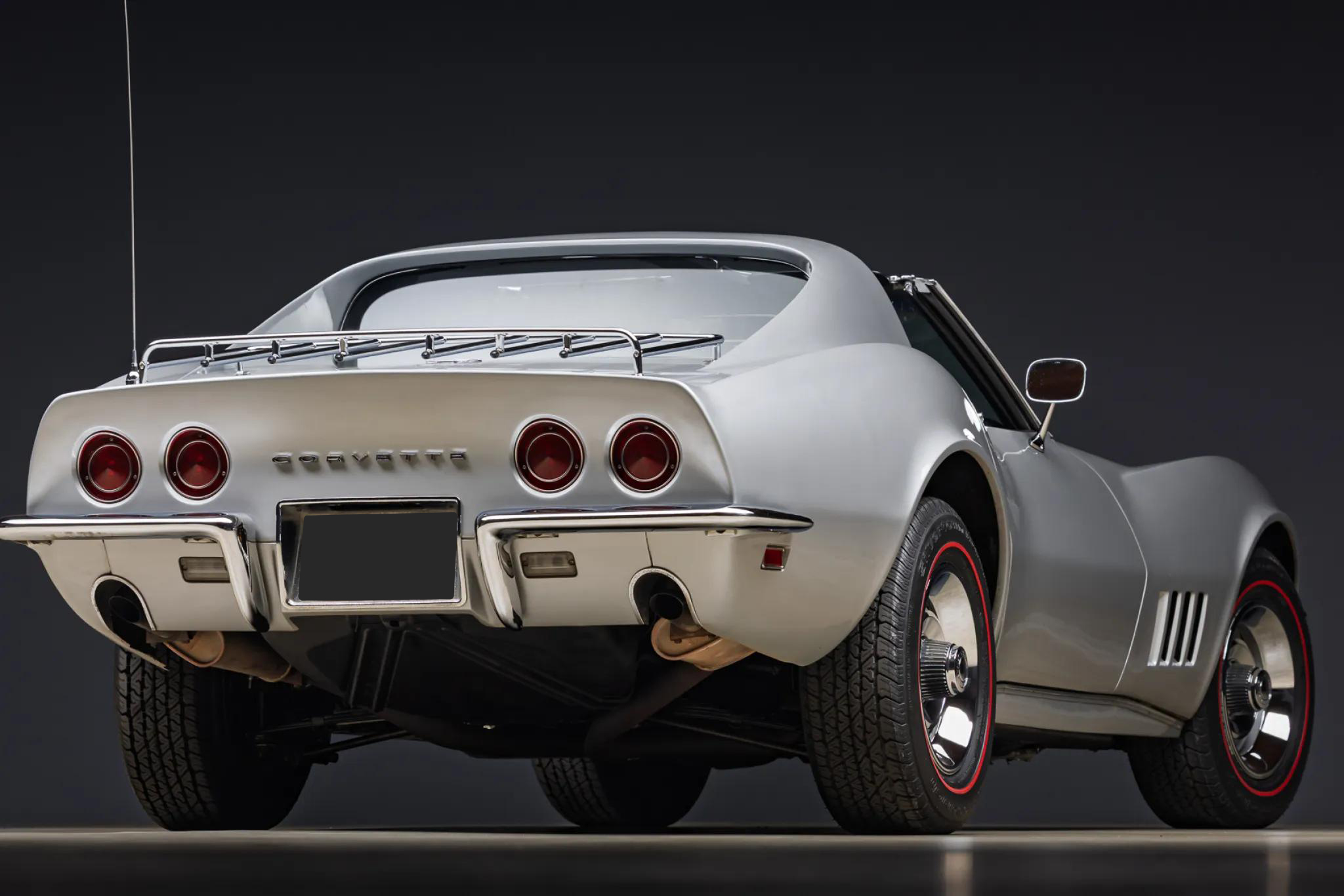 This 1968 Chevrolet Corvette coupe is powered by a 427ci L68 V8 paired with a four-speed manual transmission. Finished in Silverstone Silver over black vinyl, the car features removable roof panels, retractable headlights, dual side mirrors, chrome bumpers, side vents, and a rear luggage rack.