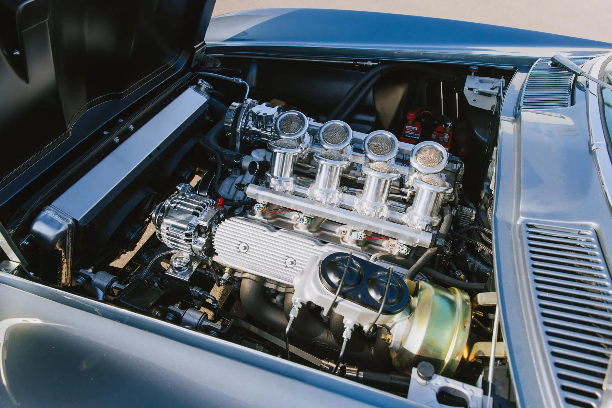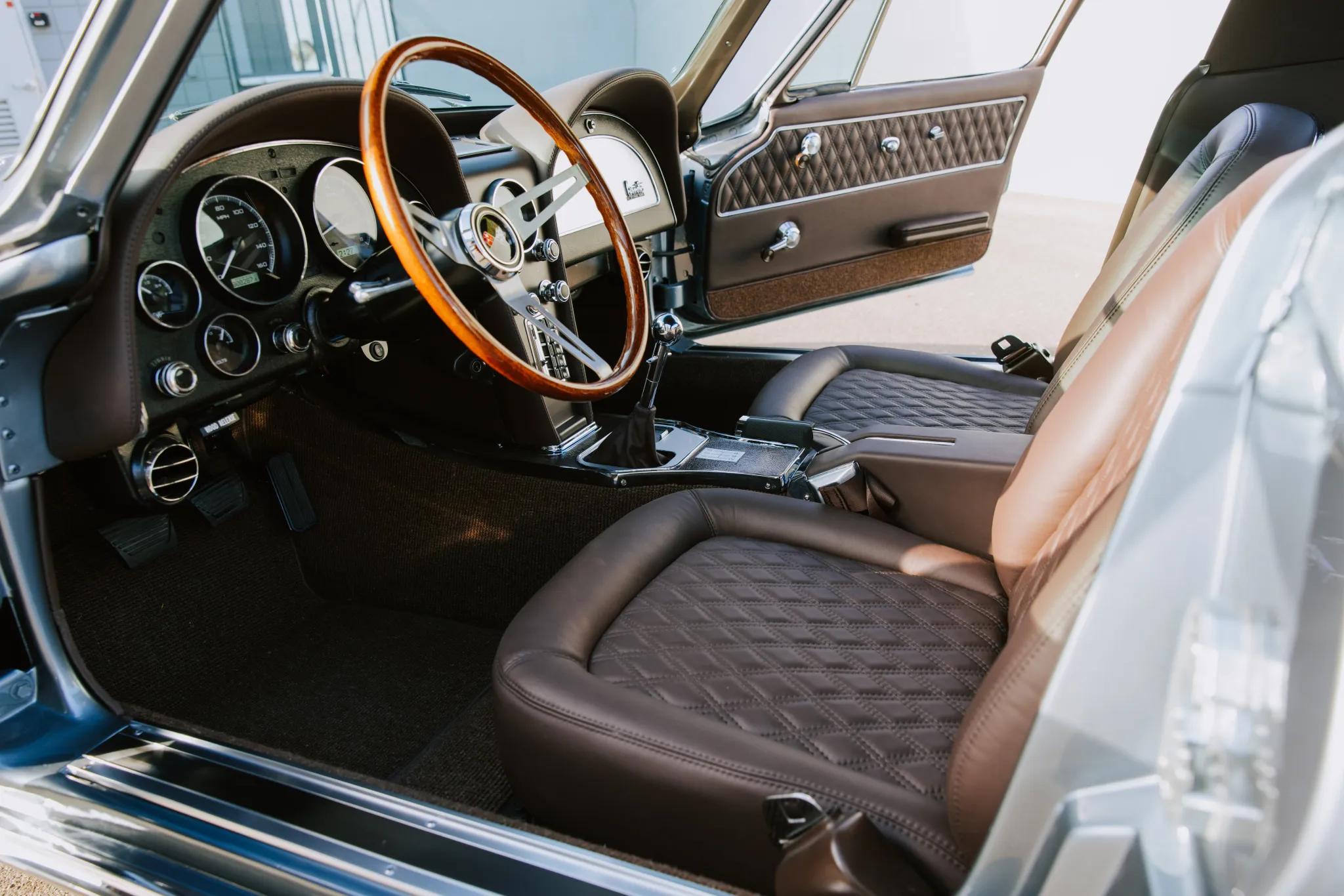 This 1967 Chevrolet Corvette coupe was modified with a Roadster Shop SPEC7 chassis, C7-spec suspension, an LS3 V8, and a Tremec five-speed manual transmission. The car is finished in a light shade of Lyndale Blue with a silver blue hood stripe.