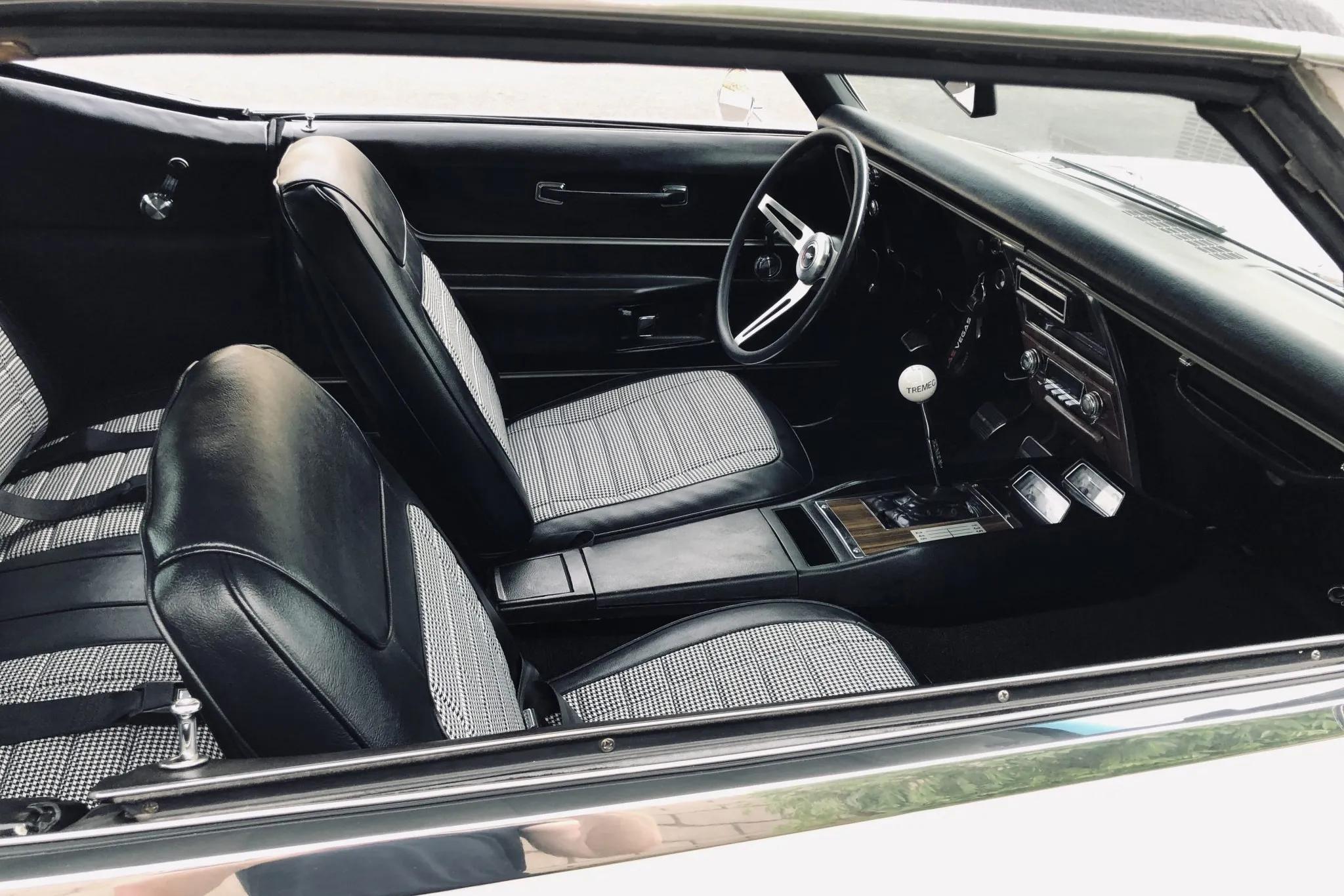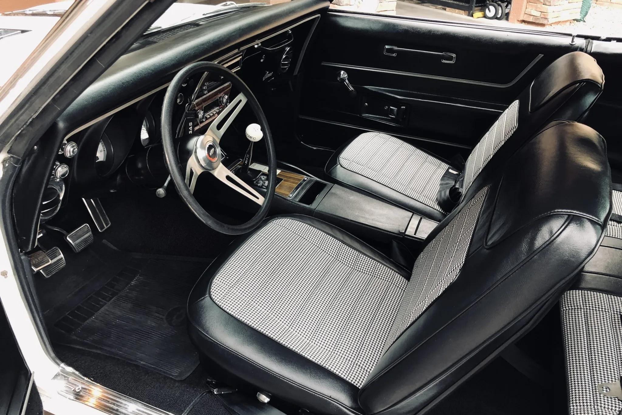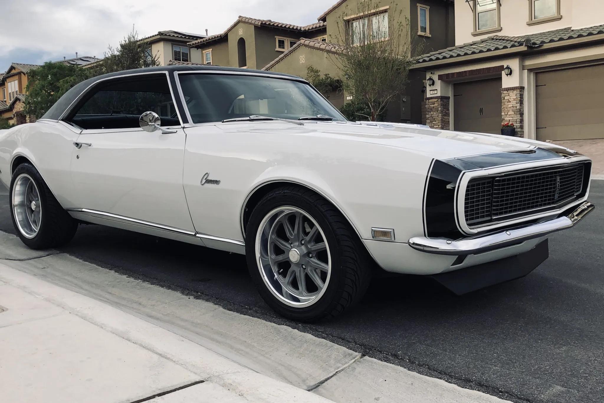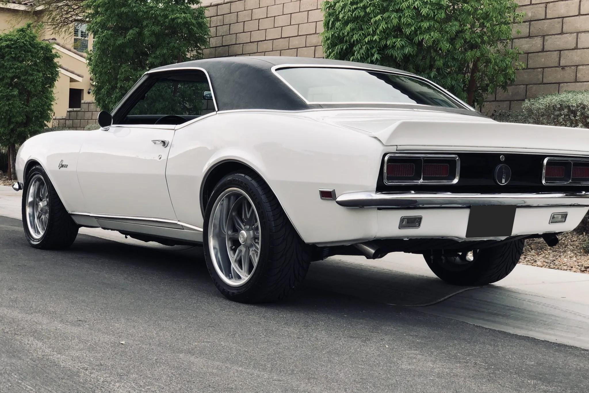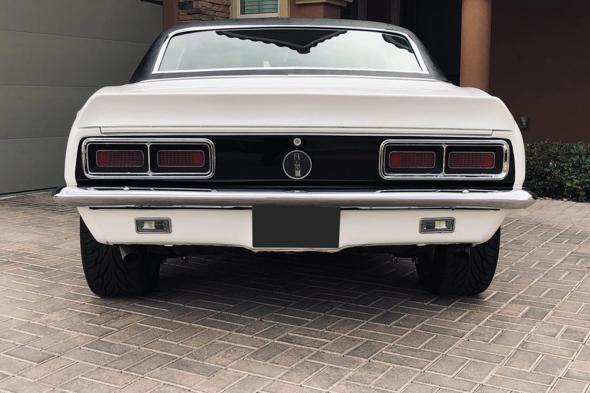 This 1968 Chevrolet Camaro coupe is finished in white with a black vinyl roof and black interior with houndstooth inserts. It is powered by a 6.0-liter LS V8 linked to a Tremec six-speed manual transmission. The car was refurbished prior to the seller's acquisition in January 2022, with work including installation of a cold-air intake system, aluminum radiator, electric cooling fans, chrome engine trim, stainless steel exhaust system, Wilwood disc brakes at all four corners, tubbed wheel wells, US Mags alloy wheels (17" front, 18" rear) wrapped in 235/45 and 255/45 Federal Super Steel 595 tires, hideaway headlights, RS badging, Super Sport-style front stripe, front and rear spoilers, dual mirrors, and Dakota Digital instrumentation. Additional mechanical updates include an aluminum driveshaft and Strange Engineering axles.