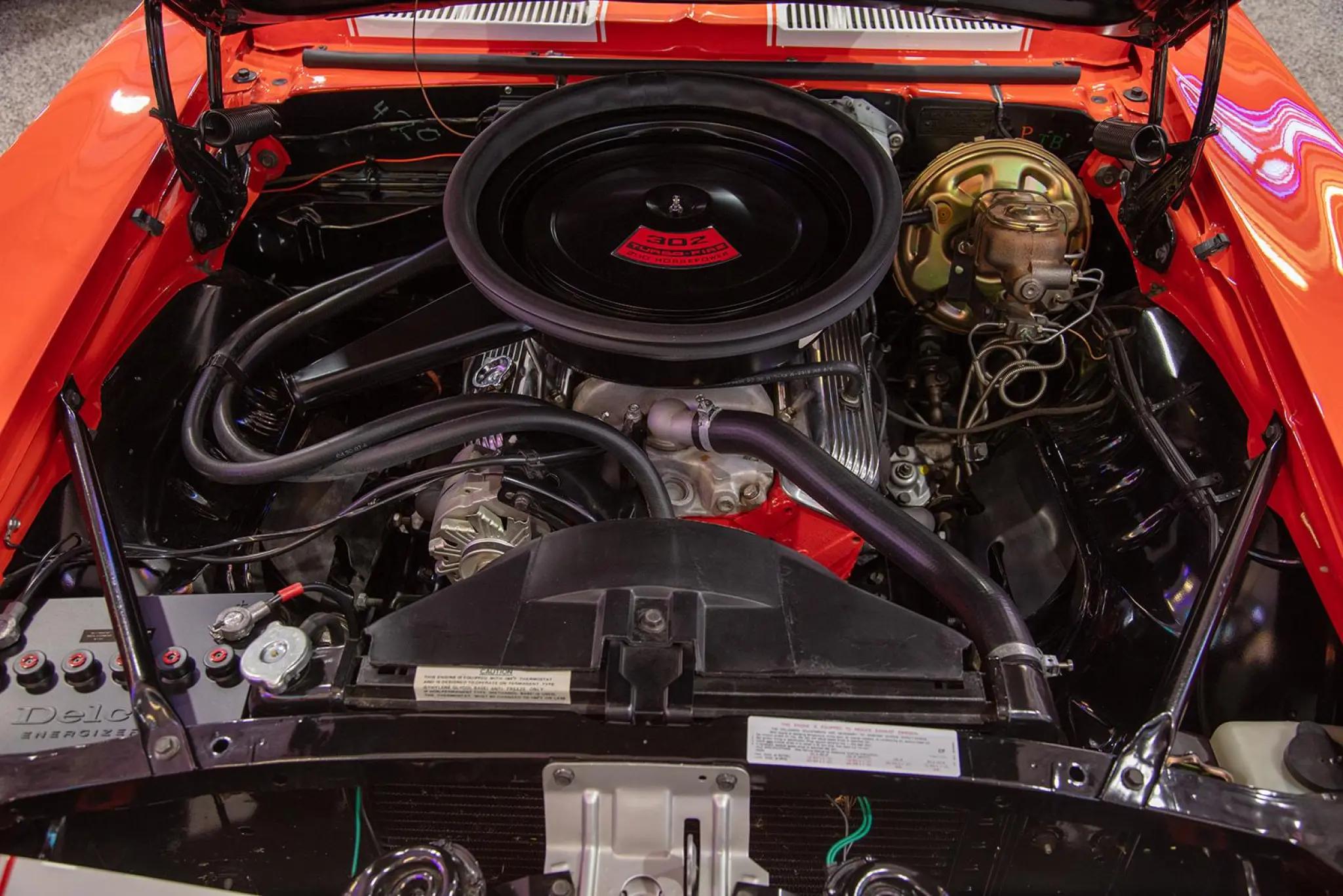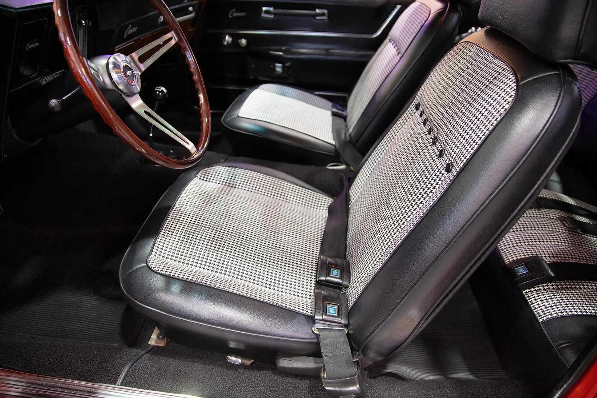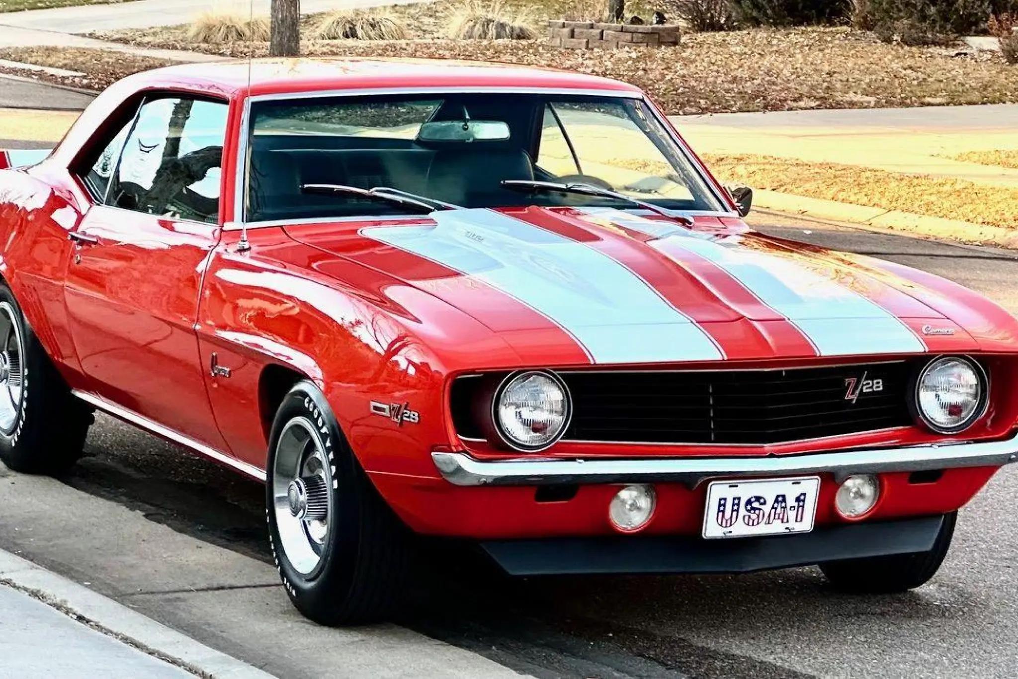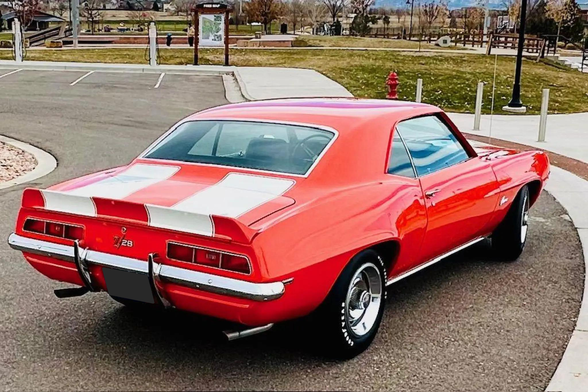 This 1969 Chevrolet Camaro coupe was delivered new to Frontier Chevrolet of Billings, Montana, and remained in the state until the seller's acquisition in 2022. The car underwent a refurbishment by the previous owner in 2018 after roughly 35 years of storage, which included refinishing the body in Hugger Orange with white stripes and reupholstering the interior in black and ivory vinyl houndstooth. It is powered by a replacement 302ci V8 paired with a Muncie M21 four-speed manual transmission and a PosiTraction differential.