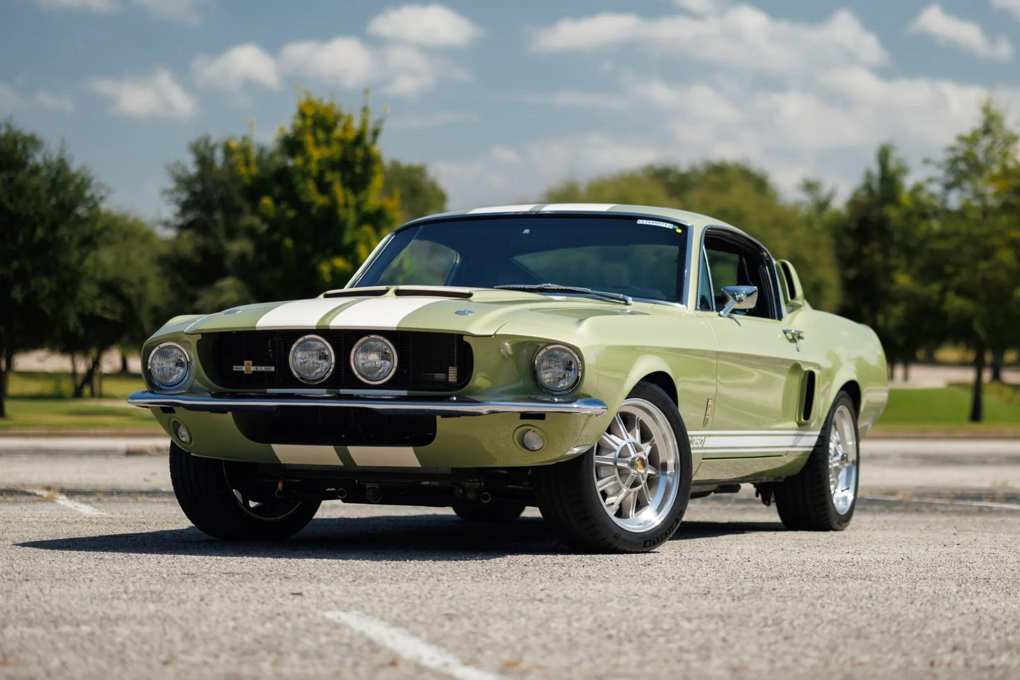 This Shelby Mustang GT350 fastback recreation is finished in Lime Gold with Wimbledon White stripes and is powered by a 5.0-liter Gen 3 Coyote V8 paired with a 10-speed automatic transmission. The bolstered front seats and folding rear seats are upholstered in black Nappa leather, with matching dashboard and door panels. Interior amenities include air conditioning, remote keyless entry, push-button ignition, power windows and locks, three-point inertia-reel front seatbelts, and a touchscreen entertainment system with a reversing camera. The wood-rimmed steering wheel is mounted to a tilting column. The 120-mph speedometer and 8k-rpm tachometer feature inset digital displays, complemented by gauges for fuel level, oil pressure, and coolant temperature. The digital odometer shows 2,300 miles, representing distance driven since completion.