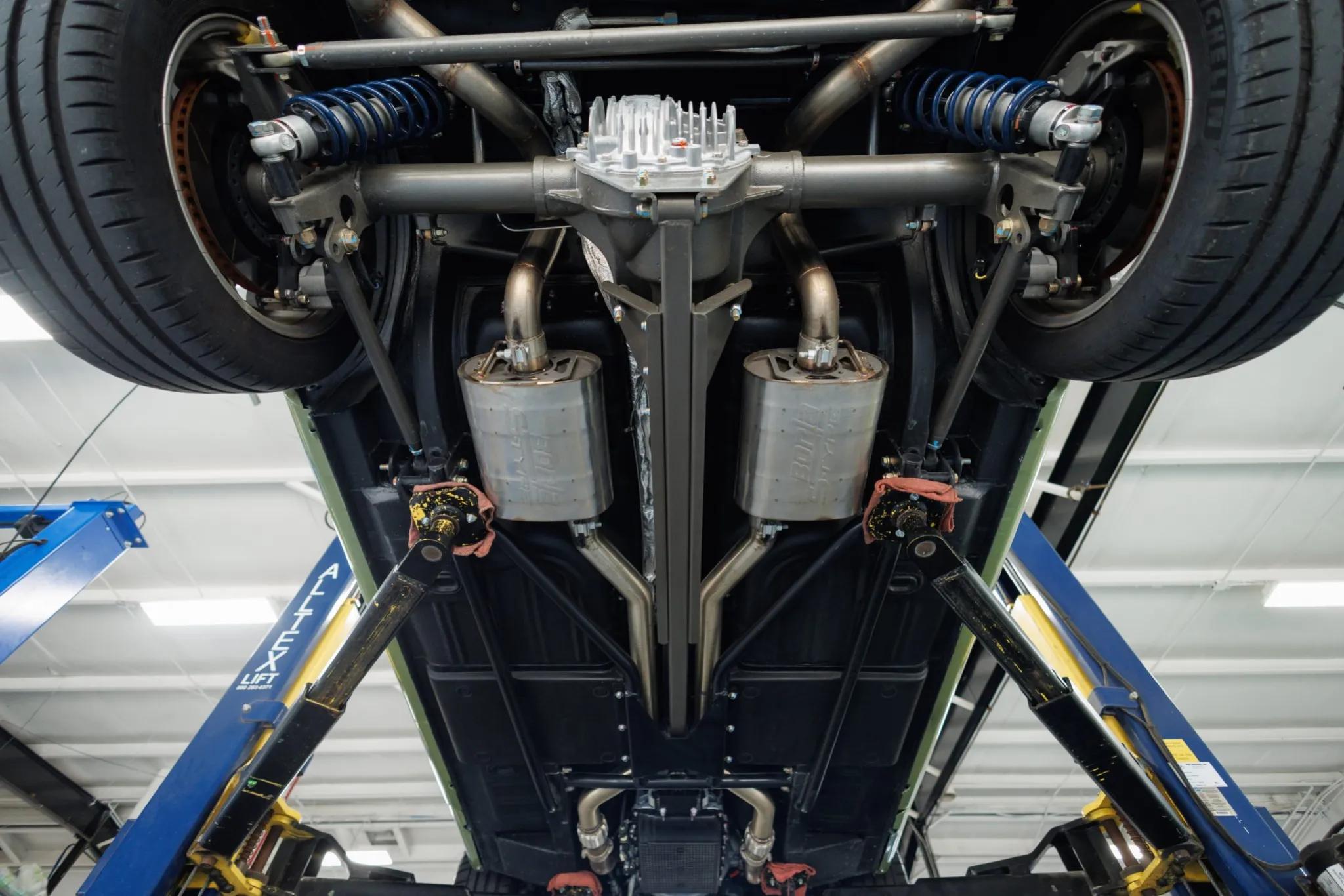 The chassis features independent front suspension and Ridetech coilovers at all four corners. Stopping power is provided by Wilwood four-wheel disc brakes with black calipers. The 5.0-liter Ti-VCT Coyote V8 produces 460 horsepower and is equipped with a Borla Performance Sound dual exhaust system with polished finishers. Power is sent to the rear wheels through a Ford 10R80 10-speed automatic transmission and a Ford 8.8" rear axle with a 3.31 Traction-Lok limited-slip differential and finned aluminum cover.