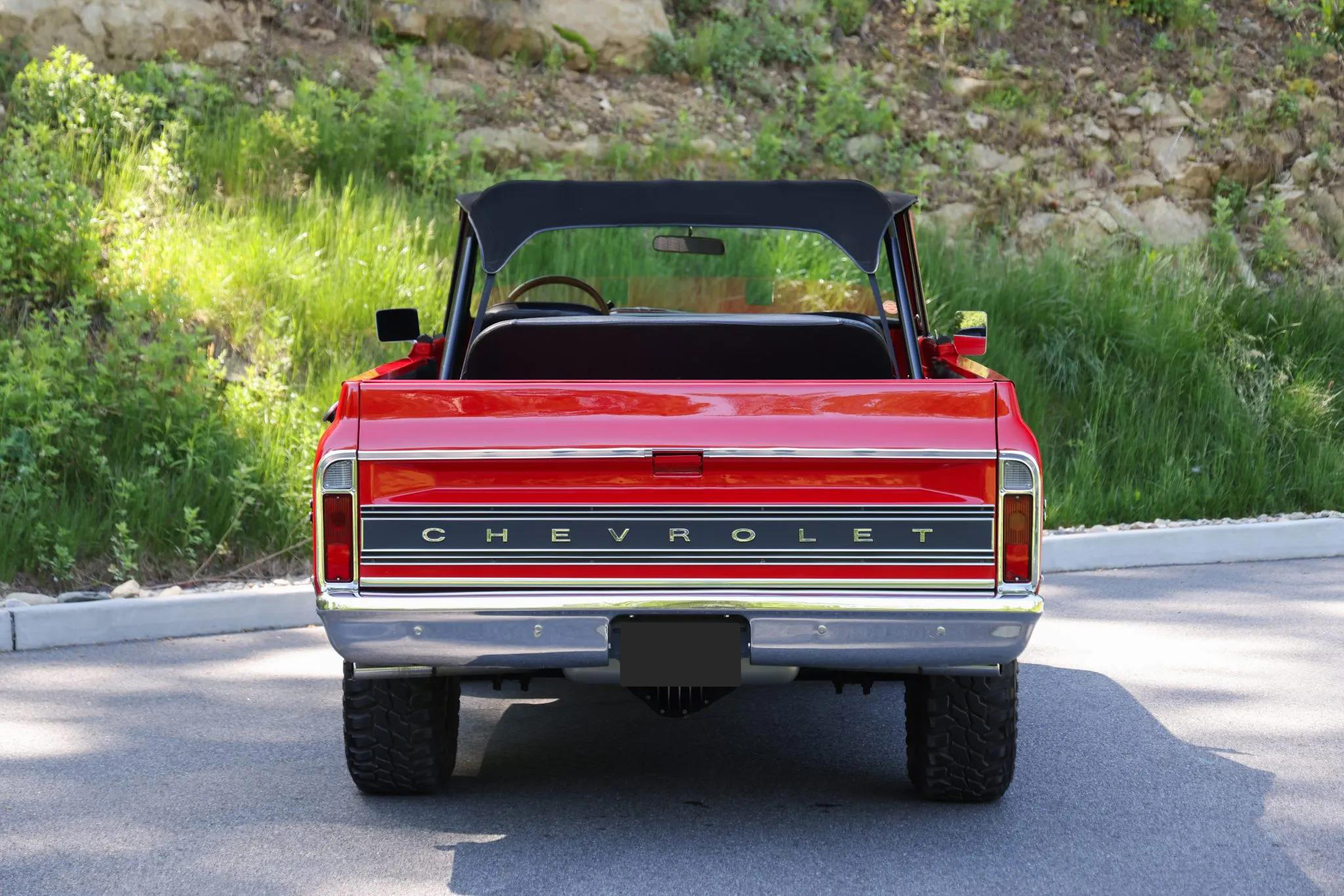 This 1971 Chevrolet K5 Blazer is finished in red over black vinyl seats with houndstooth inserts and is powered by a carbureted 350ci V8 paired with a three-speed TH350 automatic transmission and a dual-range transfer case. The body was removed from the frame for rust repair and refinished in red, and the truck rides on 15" Rally-style wheels fitted with 32�11.50" Mastercraft Courser MXT tires.