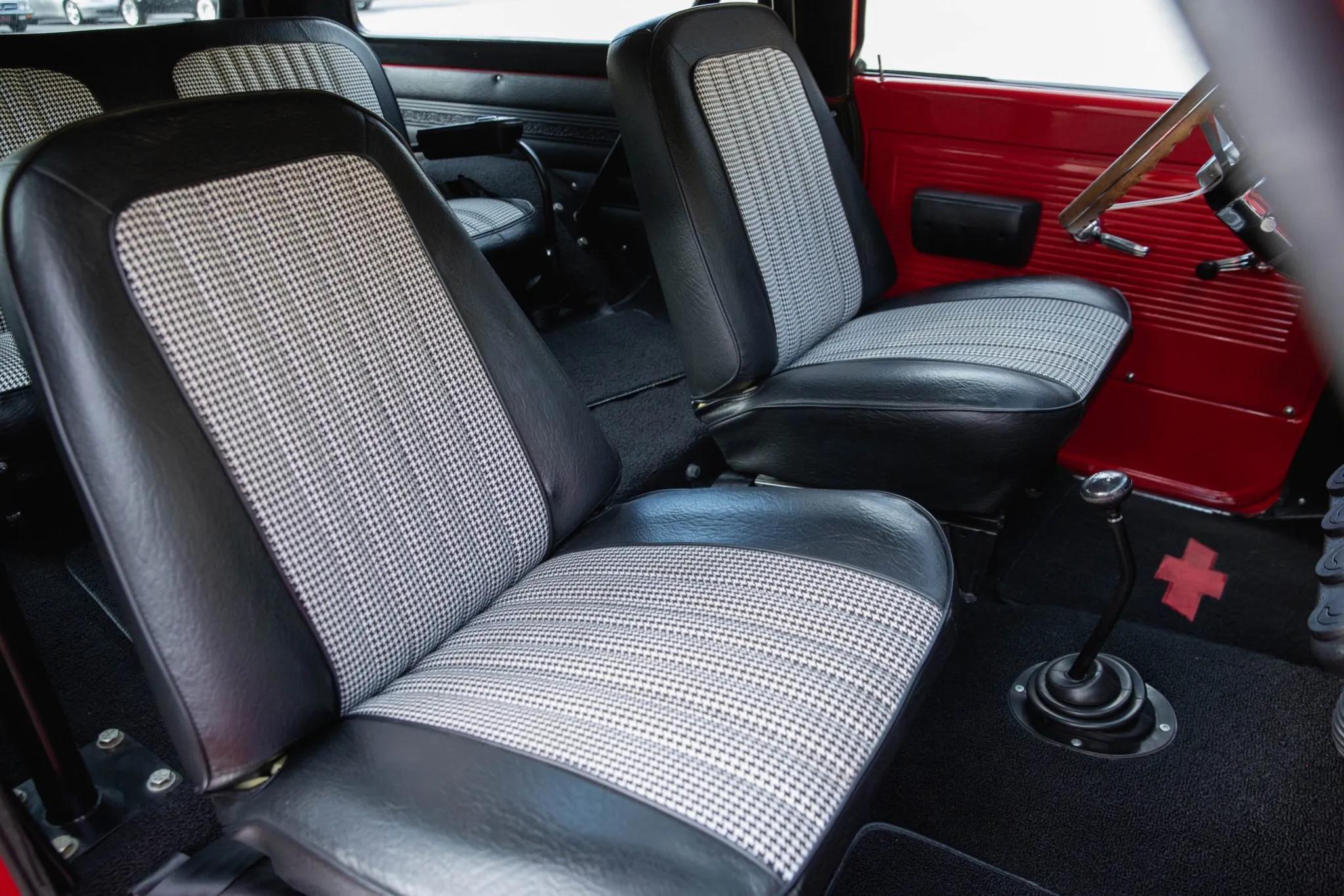 The cabin features front bucket seats and a rear bench trimmed in black vinyl with houndstooth inserts, body-color sheetmetal surfaces, a wood-rimmed steering wheel, a 100-mph speedometer with supplementary gauges, lap belts, hand-crank side windows, air conditioning, a RetroSound head unit, and JL Audio speakers.