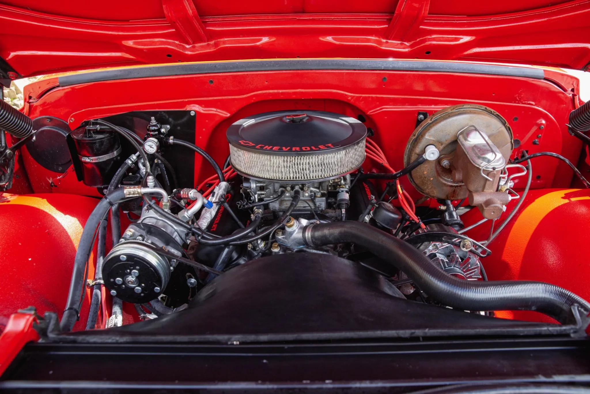 The 350ci V8 was overhauled during refurbishment, with the oil pan, timing cover, and valve covers resealed. Power is delivered to the rear or all four wheels through the TH350 automatic transmission and dual-range transfer case, with a transmission linkage bushing replaced during service. Fluid maintenance was performed in preparation for use.