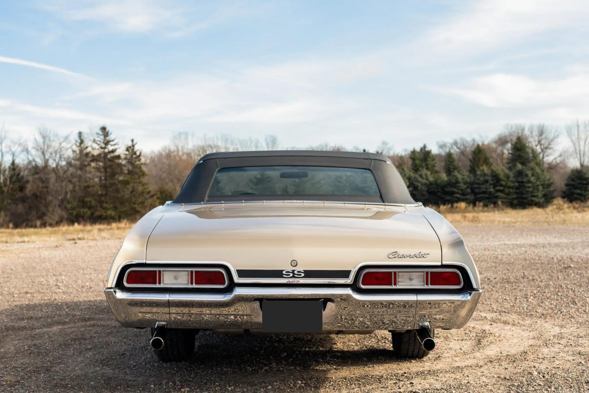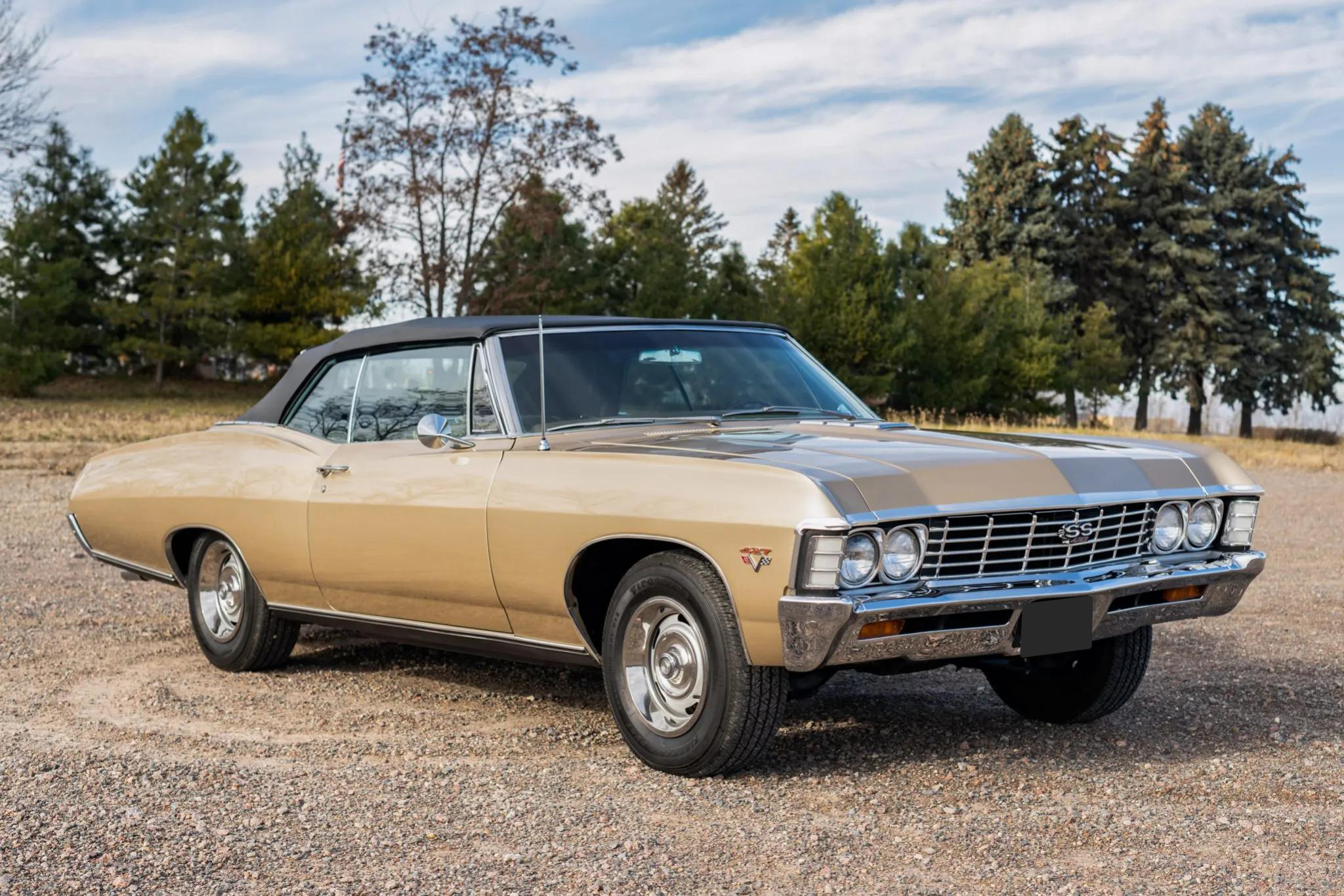 This 1967 Chevrolet Impala SS convertible is finished in gold with a black power-operated soft top and features a gold vinyl interior. It is powered by a ZZ427 427ci crate V8 rated at 430 horsepower, equipped with an aluminum intake manifold and cylinder heads, an HEI distributor, a four-barrel carburetor, and a serpentine accessory drive system. Power is sent to the rear wheels through a Tremec five-speed manual transmission and a limited-slip differential with a custom-fabricated driveshaft.