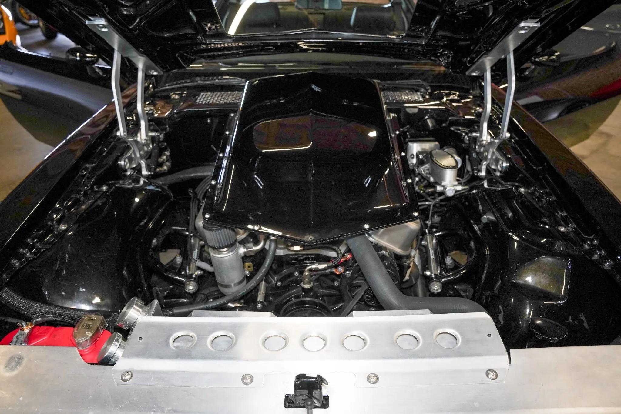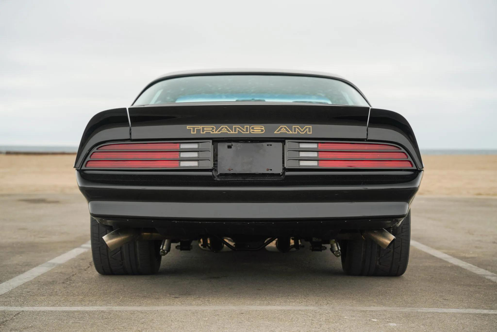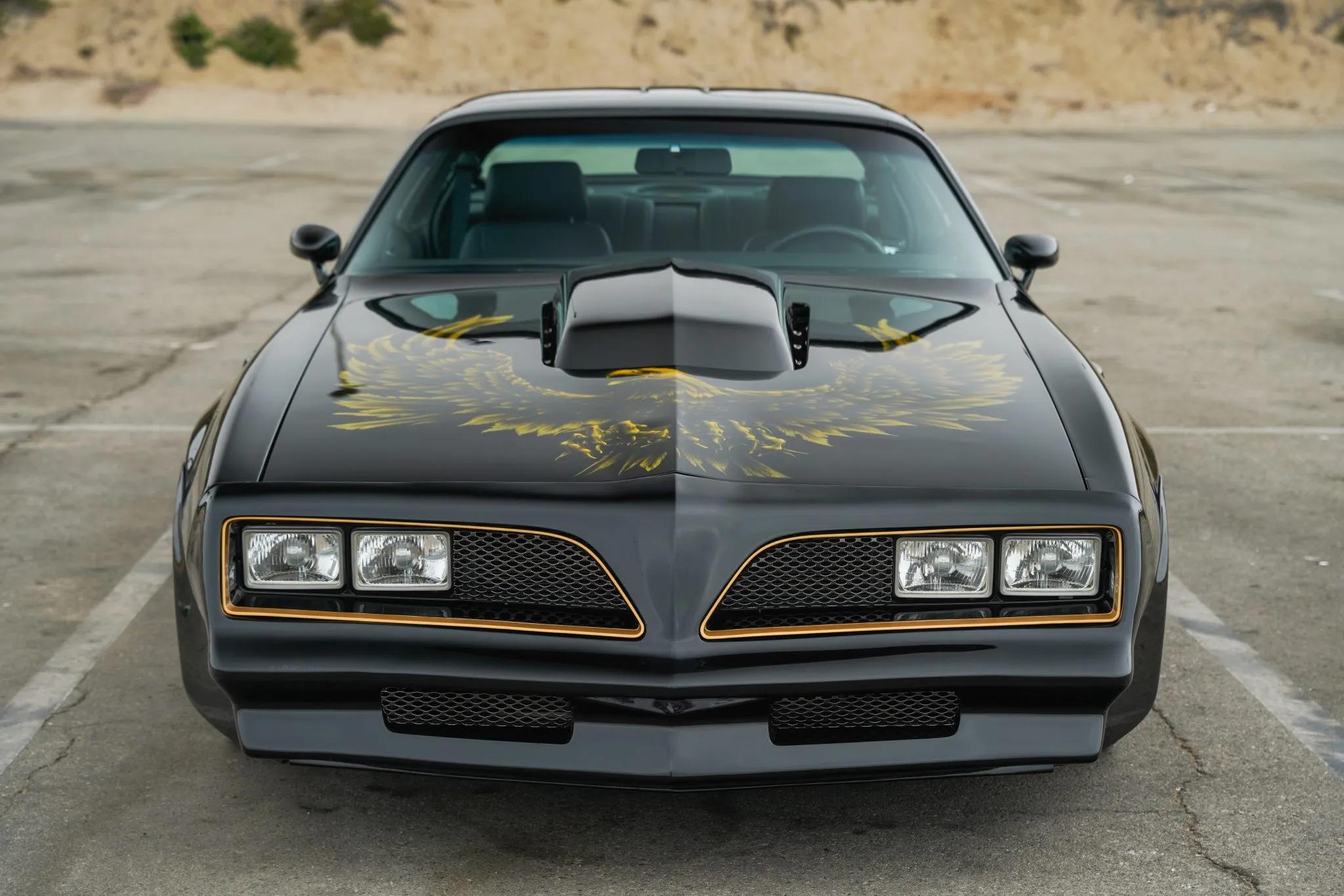 This 1978 Pontiac Firebird Trans Am is finished in Starlight Black with a gold-airbrushed hood eagle and features a black leather interior. It is powered by an all-aluminum 572ci Merlin V8 equipped with Holley Terminator X electronic fuel injection, 1,000cc FIC injectors, a Holley Dual-Sync distributor, long-tube headers, dual electric cooling fans, an aluminum radiator, ATI Super Damper harmonic crankshaft balancer, and a high-torque mini starter. Power is sent to the rear wheels through a six-speed manual transmission and a limited-slip differential, complemented by a hydraulically actuated McLeod RXT twin-disc clutch.