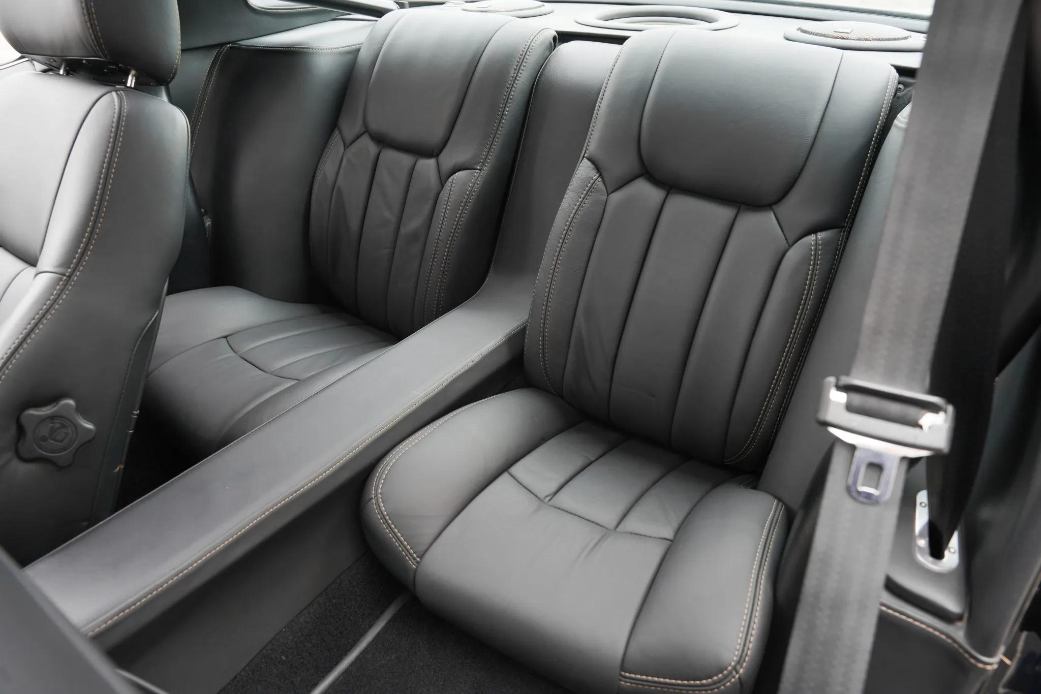 The cabin features front bucket seats and custom individual rear seats upholstered in black leather, with matching leather covering the dashboard, center console, and door panels. Interior appointments include air conditioning, a roll bar, Hurst shifter, a Viper alarm system, and a Bluetooth-capable Alpine stereo linked to Focal amplifiers and speakers. The leather-wrapped steering wheel fronts gold engine-turned instrumentation consisting of a 160-mph speedometer, 10k-rpm tachometer, and gauges for oil pressure, coolant temperature, voltage, and fuel level.