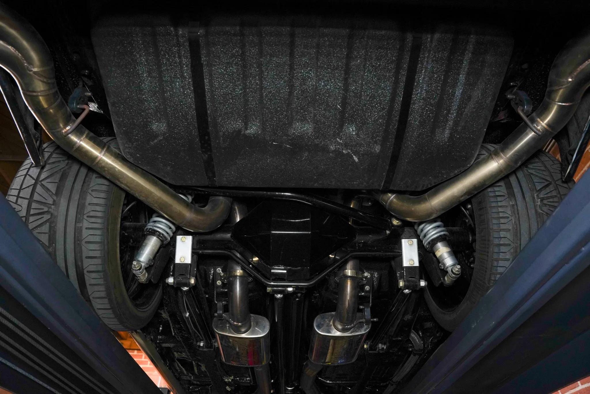 Exterior features include a shaker-style hood, vented fenders, front lip and rear spoilers, quad exhaust outlets, and removable T-top glass panels. The suspension was upgraded with a revised front subframe, aftermarket sway bars, tubular control arms, traction bars, and adjustable QA1 coilovers. Braking is handled by Baer six-piston big brake kits with slotted and cross-drilled rotors. Gold-finished 19" Forgeline web-spoke alloy wheels with black centers are mounted with Continental ExtremeContact tires.