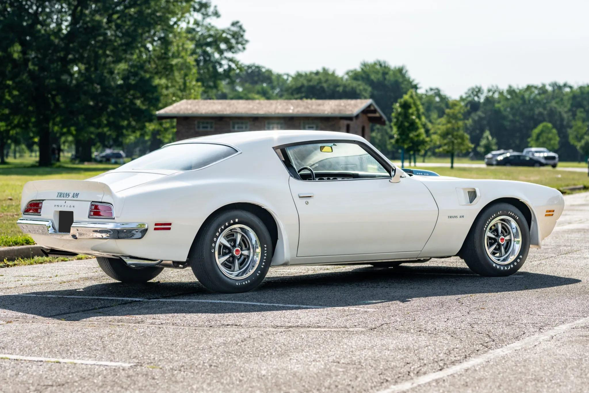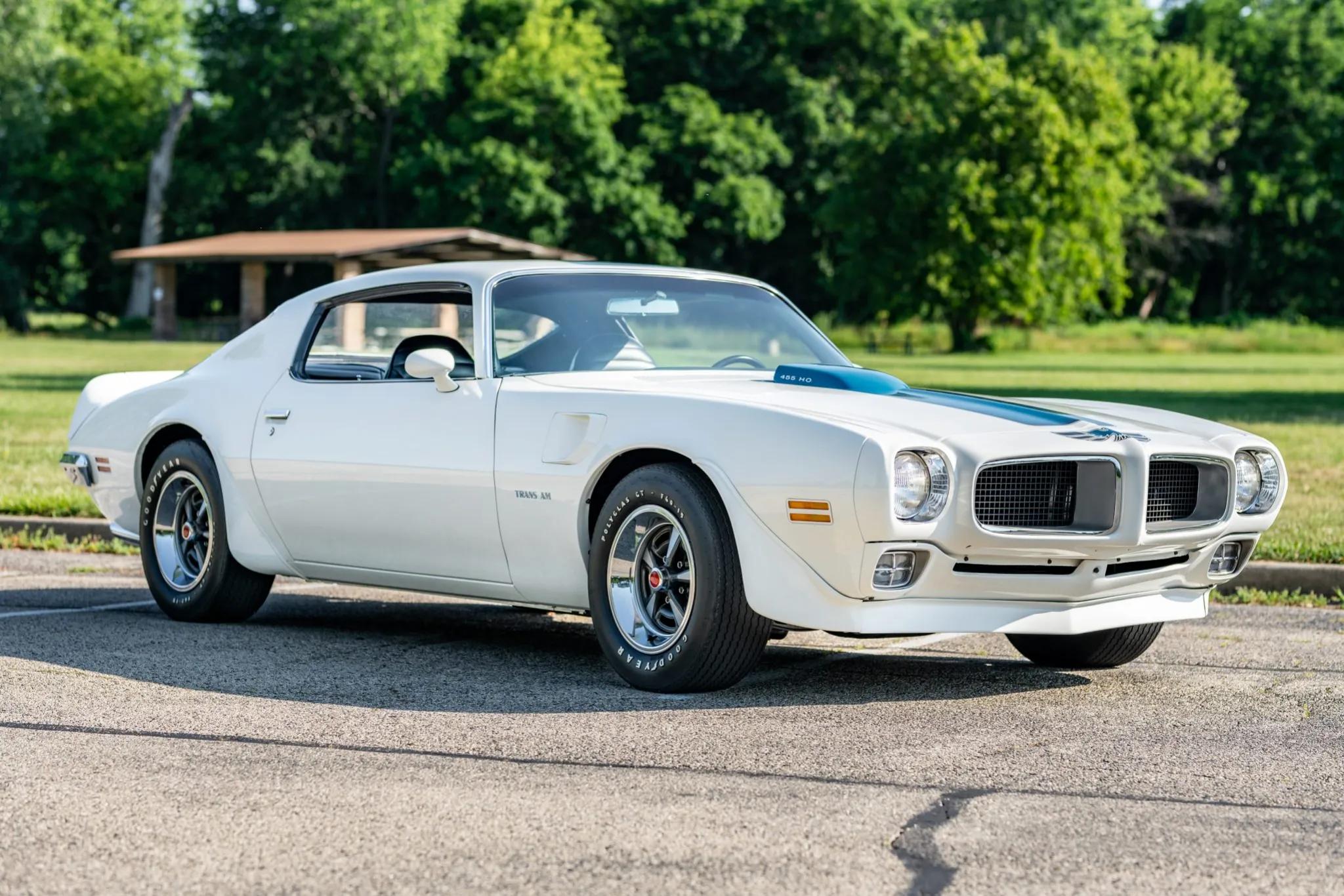 This 1971 Pontiac Firebird Trans Am is finished in white with a black interior and is powered by a 455ci High Output V8 equipped with a Rochester four-barrel carburetor. Power is sent to the rear wheels through a four-speed manual transmission and a Safe-T-Track limited-slip differential. The car features a shaker hood, front air dam, rear decklid spoiler, front fender vents, dual exhaust outlets, and 15" Rally II wheels mounted with F60-15 Goodyear Polyglas tires. Stopping power is provided by power-assisted front disc and rear drum brakes, and it is equipped with power steering.