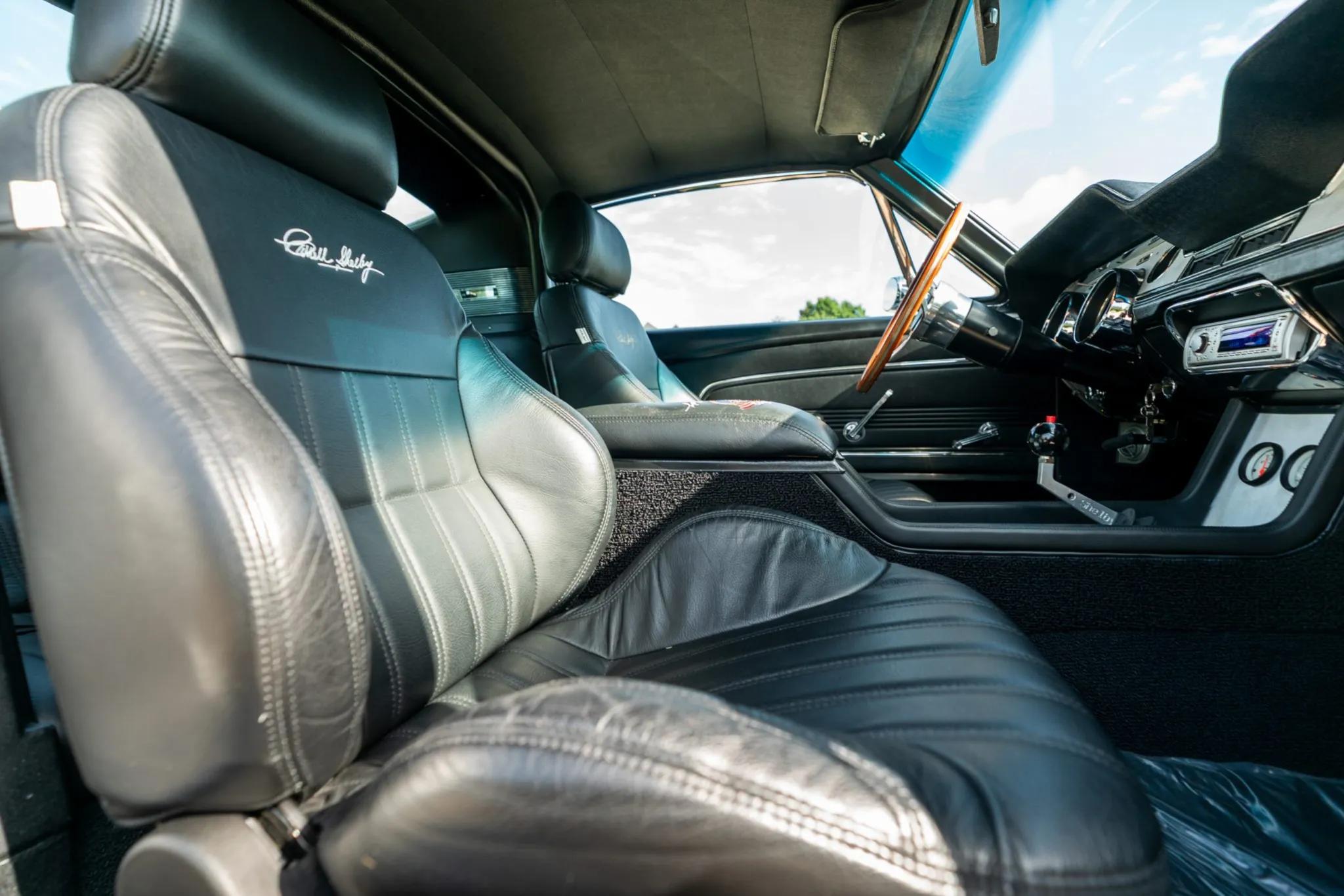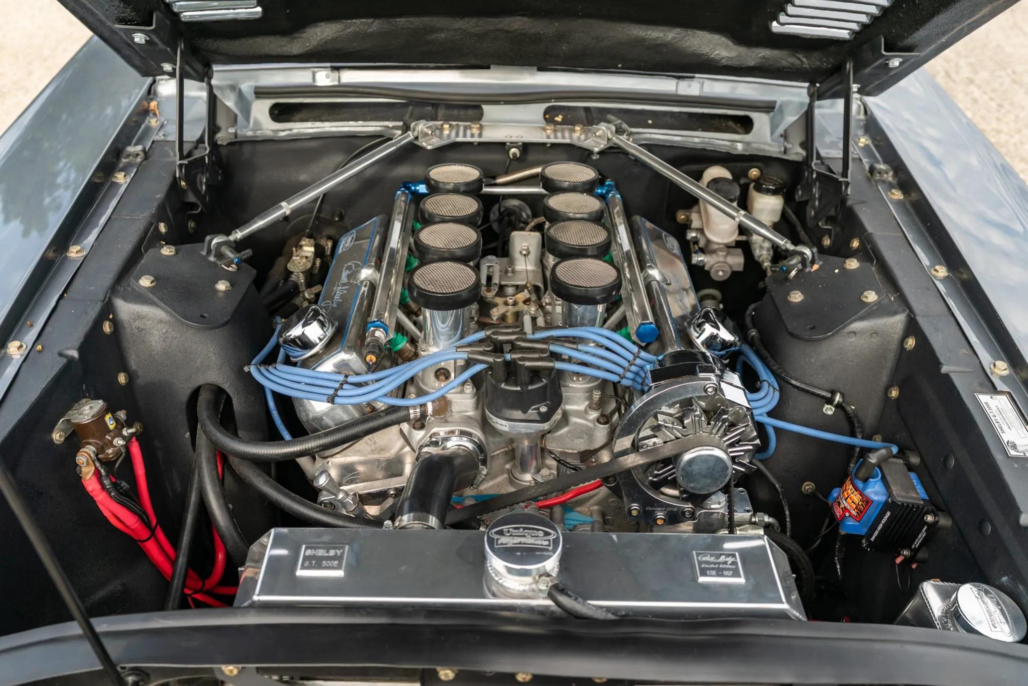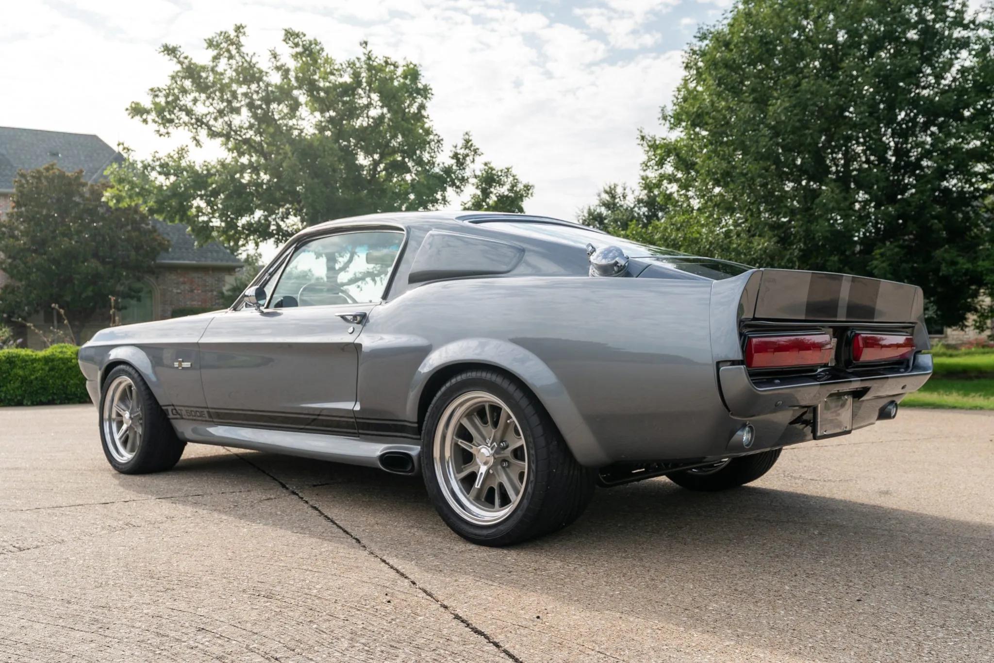 This 1968 Ford Mustang fastback was built into a 1967 Shelby GT500E by Unique Performance in 2003 and carries serial number 007. The car features Eleanor-style bodywork finished in Pepper Grey with black stripes, and a black leather interior. Power comes from a fuel-injected 427ci V8 with an eight-stack induction system. Power is sent to the rear wheels through a reinforced chassis and modified suspension.