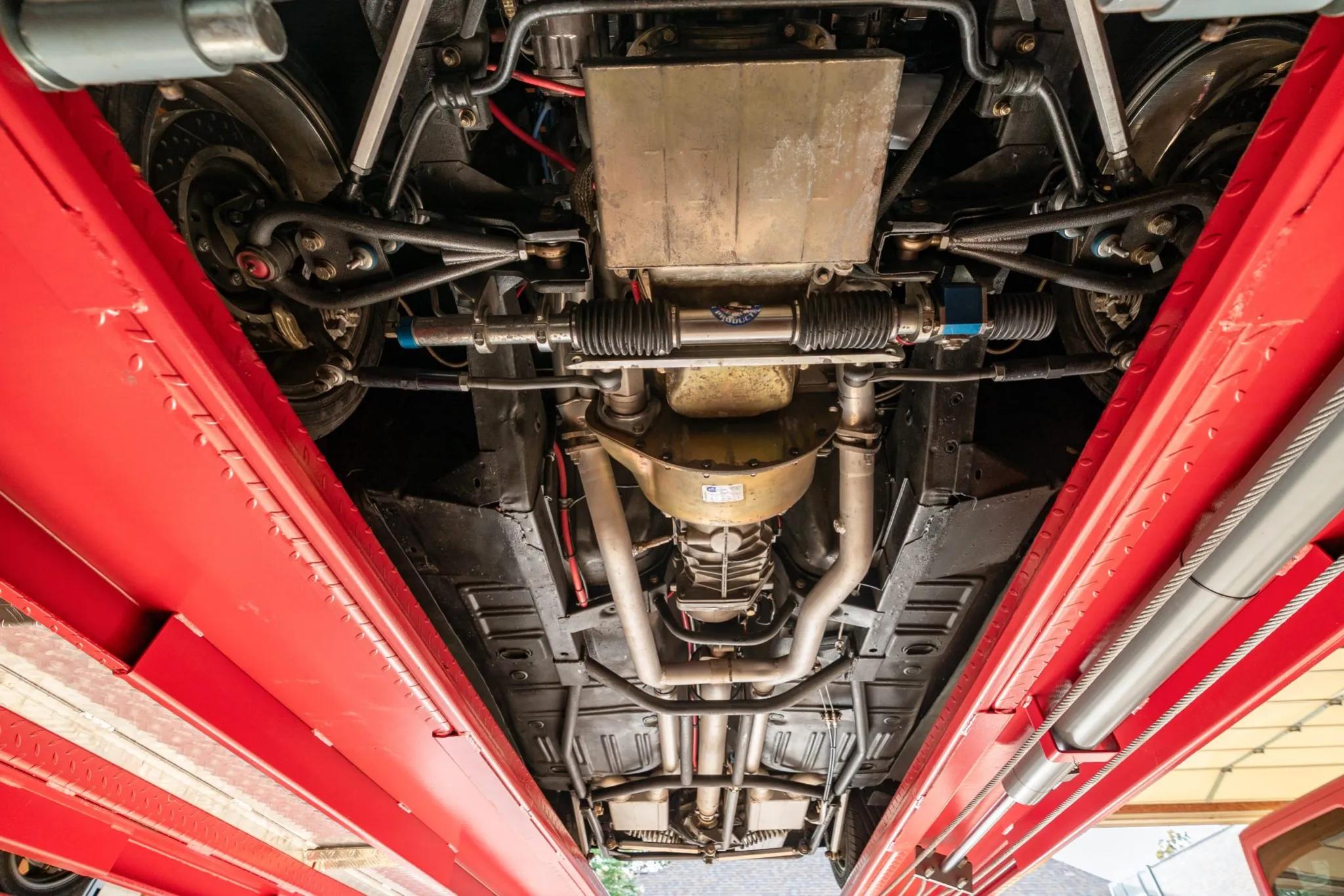 Suspension components include QA1 adjustable coilovers, tubular control arms, a reinforced subframe, pushrod rear suspension with adjustable links and a Watt's linkage, and Total Control Products power rack-and-pinion steering. Braking is provided by four-wheel Baer disc brakes, and the car rides on 17" Halibrand-style wheels with staggered Goodyear Eagle tires.